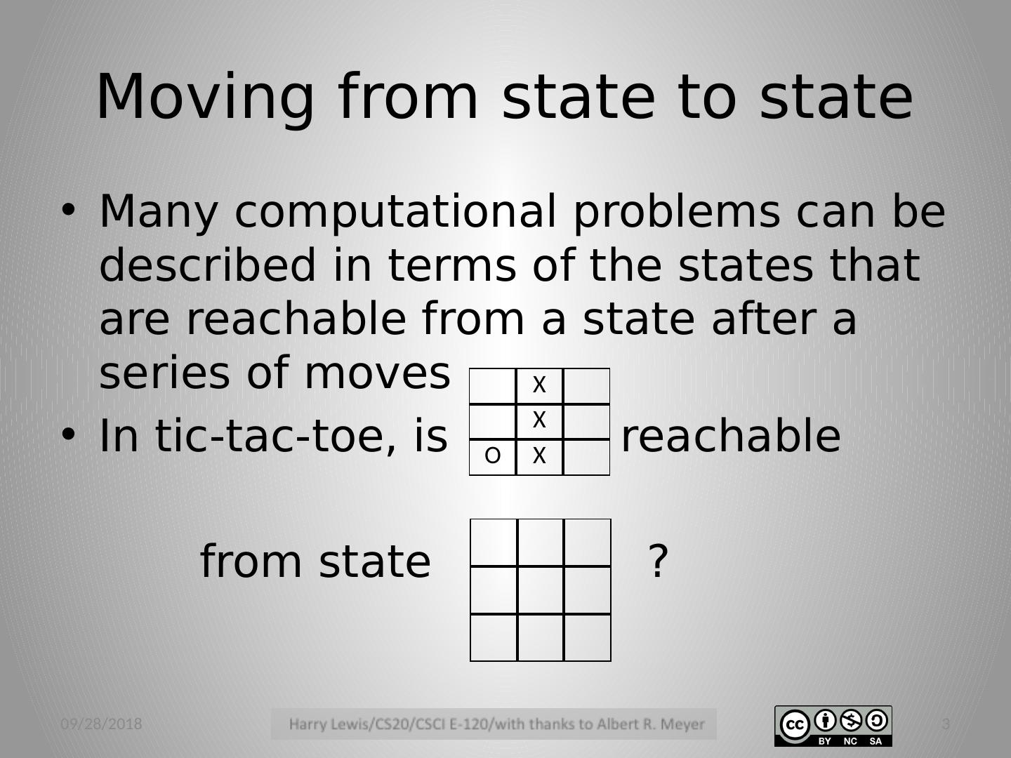 3 .Moving from state to state Many computational problems can be described in terms of the states that are reachable from a state after a series of moves In tic-tac-toe, is reachable from state ? 3/2/12 3 X X O X