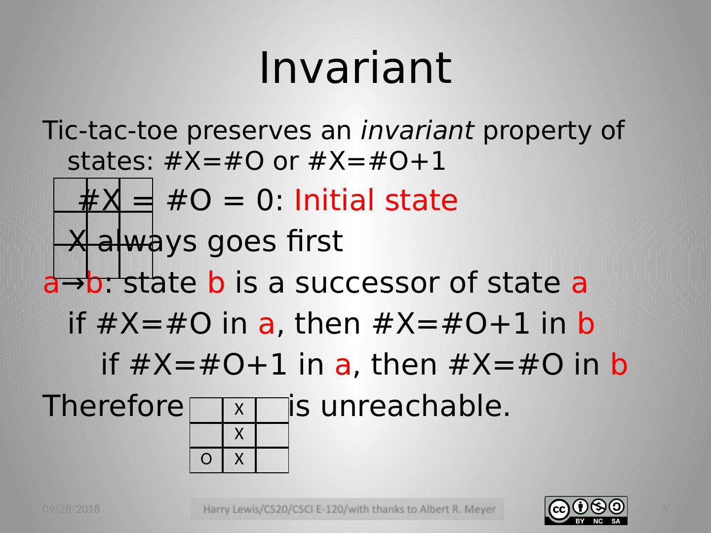 5 .Invariant Tic-tac-toe preserves an invariant property of states: #X=#O or #X=#O+1 #X = #O = 0: Initial state X always goes first a → b : state b is a successor of state a if #X=#O in a , then #X=#O+1 in b if #X=#O+1 in a , then #X=#O in b Therefore is unreachable. 3/2/12 5 X X O X