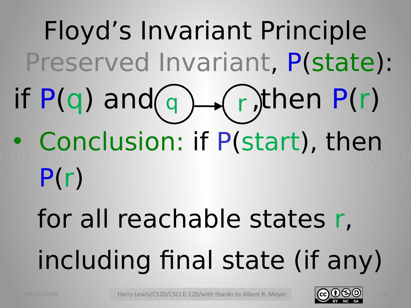 6 .Floyd’s Invariant Principle Preserved Invariant , P ( state ): if P ( q ) and ,then P ( r ) Conclusion: if P ( start ), then P ( r ) for all reachable states r , including final state (if any) q r 3/2/12 6