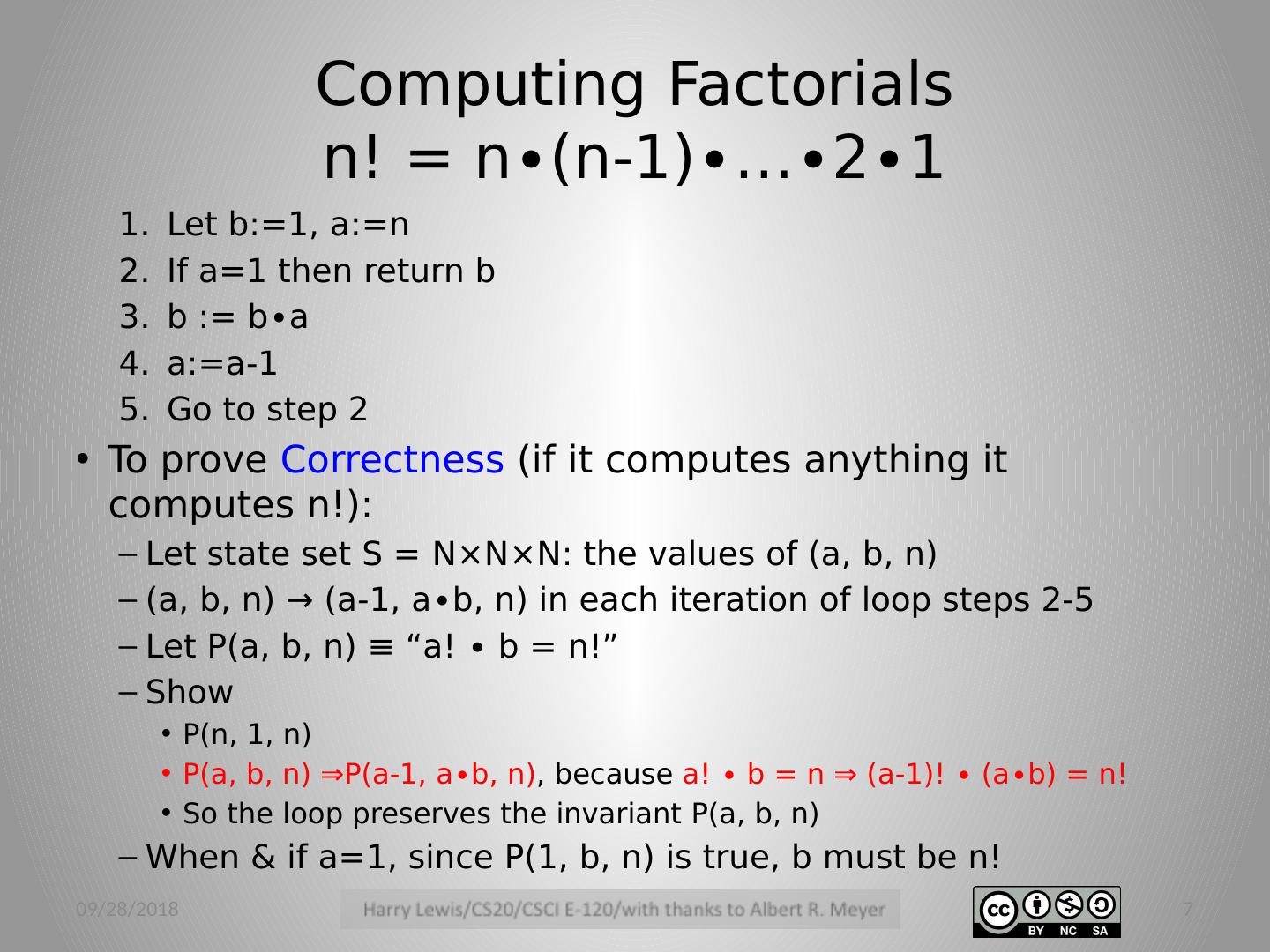 7 .Computing Factorials n ! = n∙(n-1)∙…∙2∙1 Let b :=1, a:= n If a=1 then return b b := b∙a a:=a-1 Go to step 2 To prove Correctness (if it computes anything it computes n !): Let state set S = N×N×N : the values of (a, b , n ) (a, b , n ) → (a-1, a∙b , n ) in each iteration of loop steps 2-5 Let P(a , b , n ) ≡ “a! ∙ b = n !” Show P(n , 1, n ) P(a , b , n ) ⇒P(a-1, a∙b , n ) , because a! ∙ b = n ⇒ (a-1)! ∙ ( a∙b ) = n ! So the loop preserves the invariant P(a , b , n ) When & if a=1, since P(1, b , n ) is true, b must be n ! 3/2/12 7