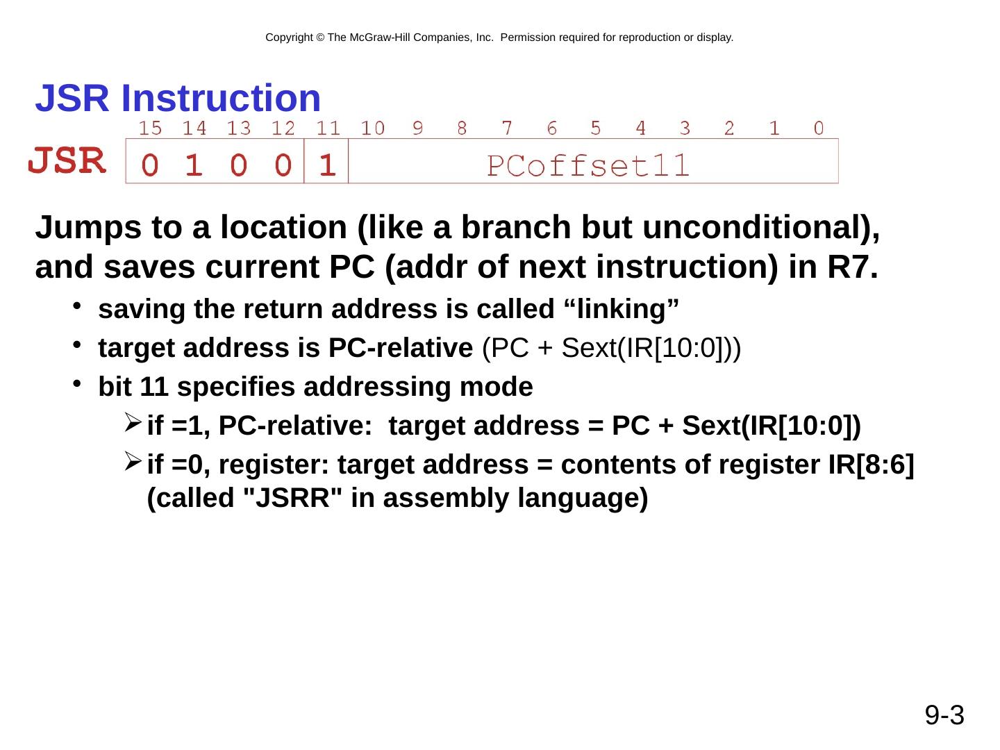 3 .9- 3 JSR Instruction Jumps to a location (like a branch but unconditional), and saves current PC ( addr of next instruction) in R7. saving the return address is called “linking” target address is PC-relative (PC + Sext (IR[10:0 ])) bit 11 specifies addressing mode if =1, PC-relative: target address = PC + Sext (IR[10:0]) if =0, register: target address = contents of register IR[8:6 ] (called "JSRR" in assembly language)