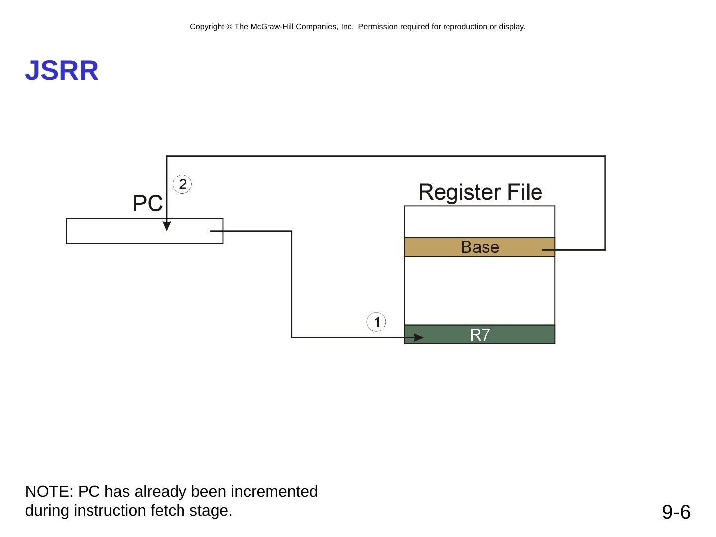 5 .9- 5 JSRR Instruction Just like JSR, except Register addressing mode. target address is Base Register bit 11 specifies addressing mode What important feature does JSRR provide that JSR does not?
