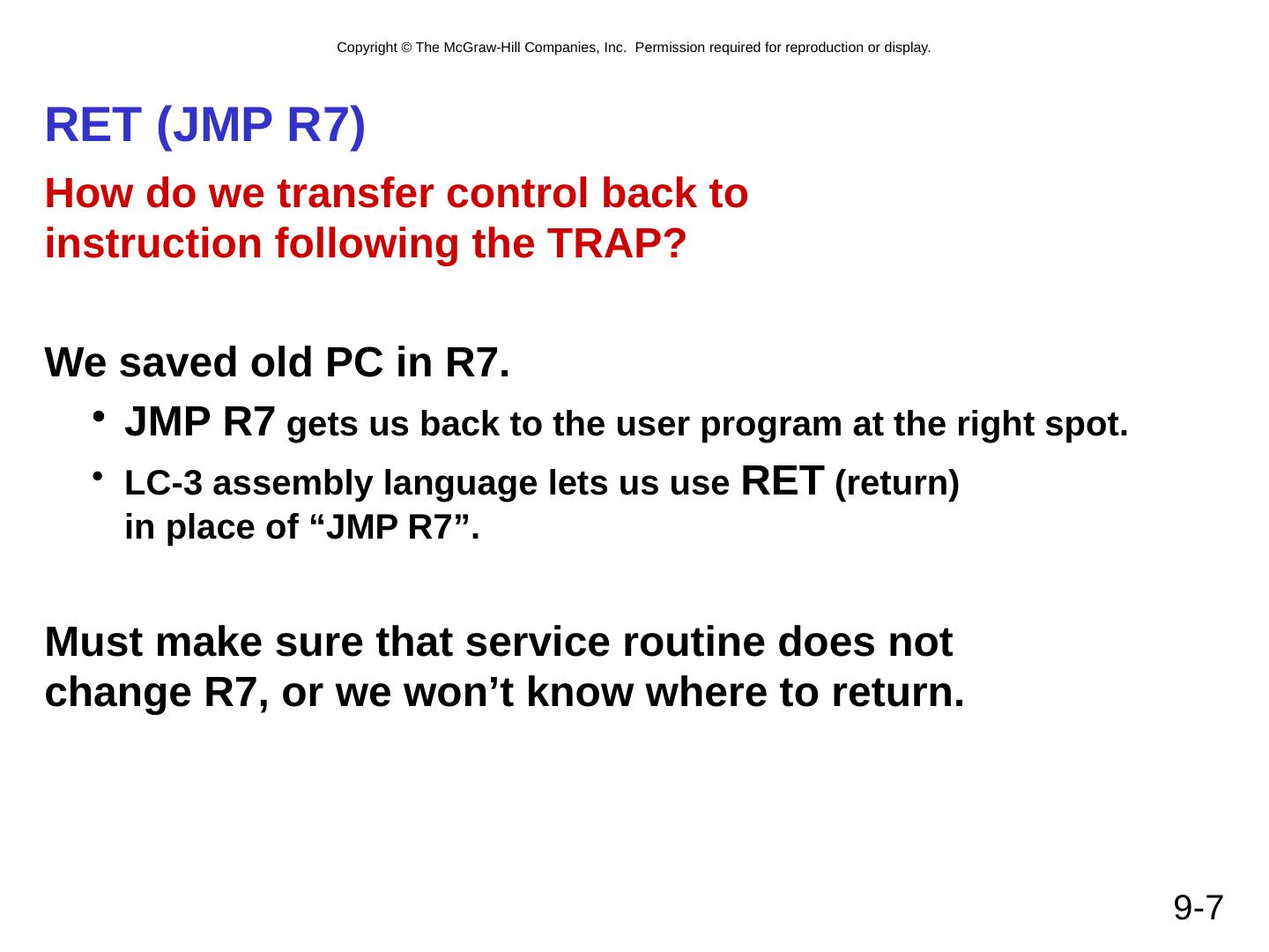 7 .9- 7 RET (JMP R7) How do we transfer control back to instruction following the TRAP? We saved old PC in R7. JMP R7 gets us back to the user program at the right spot. LC-3 assembly language lets us use RET (return) in place of “JMP R7”. Must make sure that service routine does not change R7, or we won’t know where to return.
