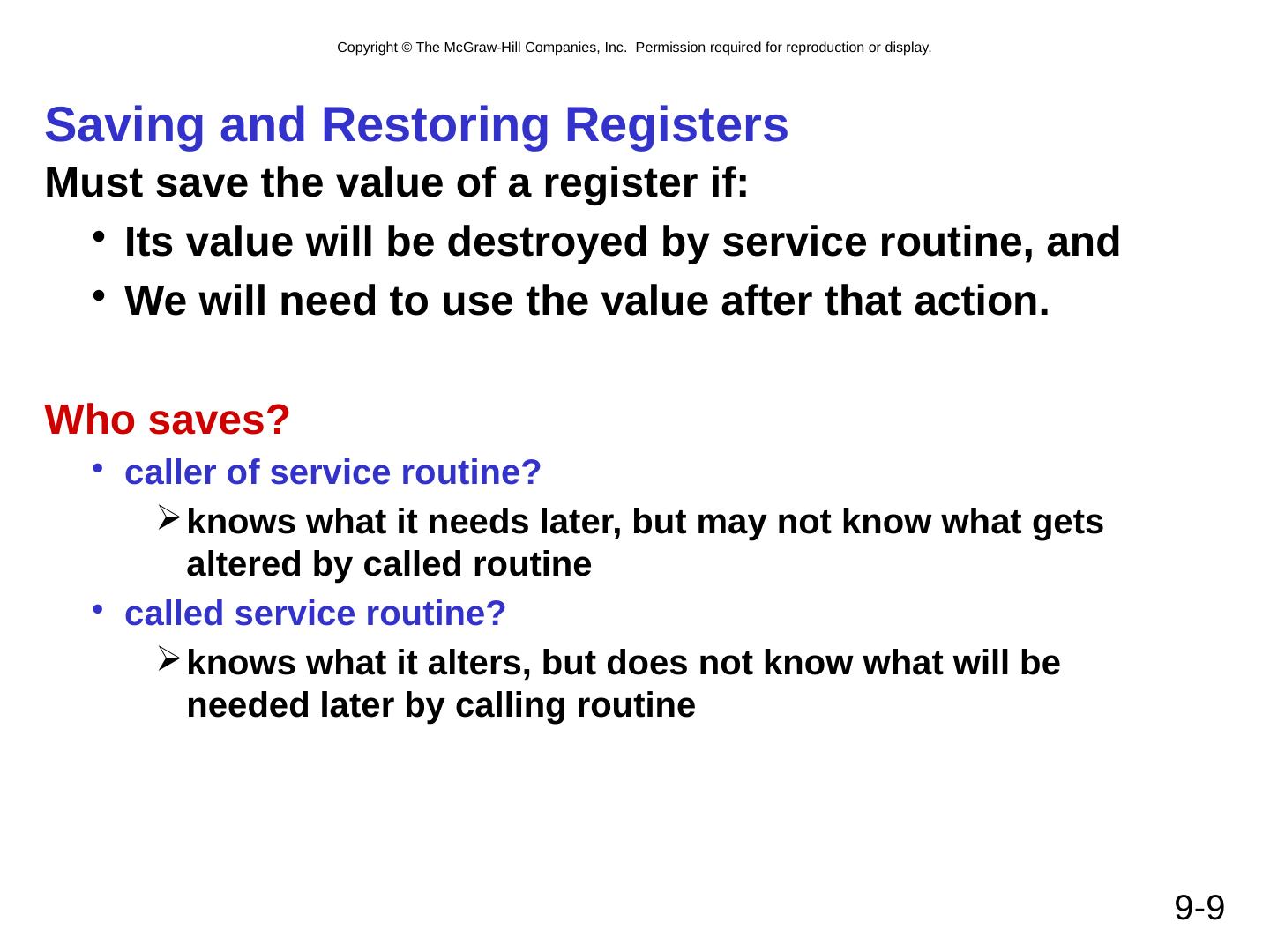 9 .9- 9 Saving and Restoring Registers Must save the value of a register if: Its value will be destroyed by service routine, and We will need to use the value after that action. Who saves? caller of service routine? knows what it needs later, but may not know what gets altered by called routine called service routine? knows what it alters, but does not know what will be needed later by calling routine
