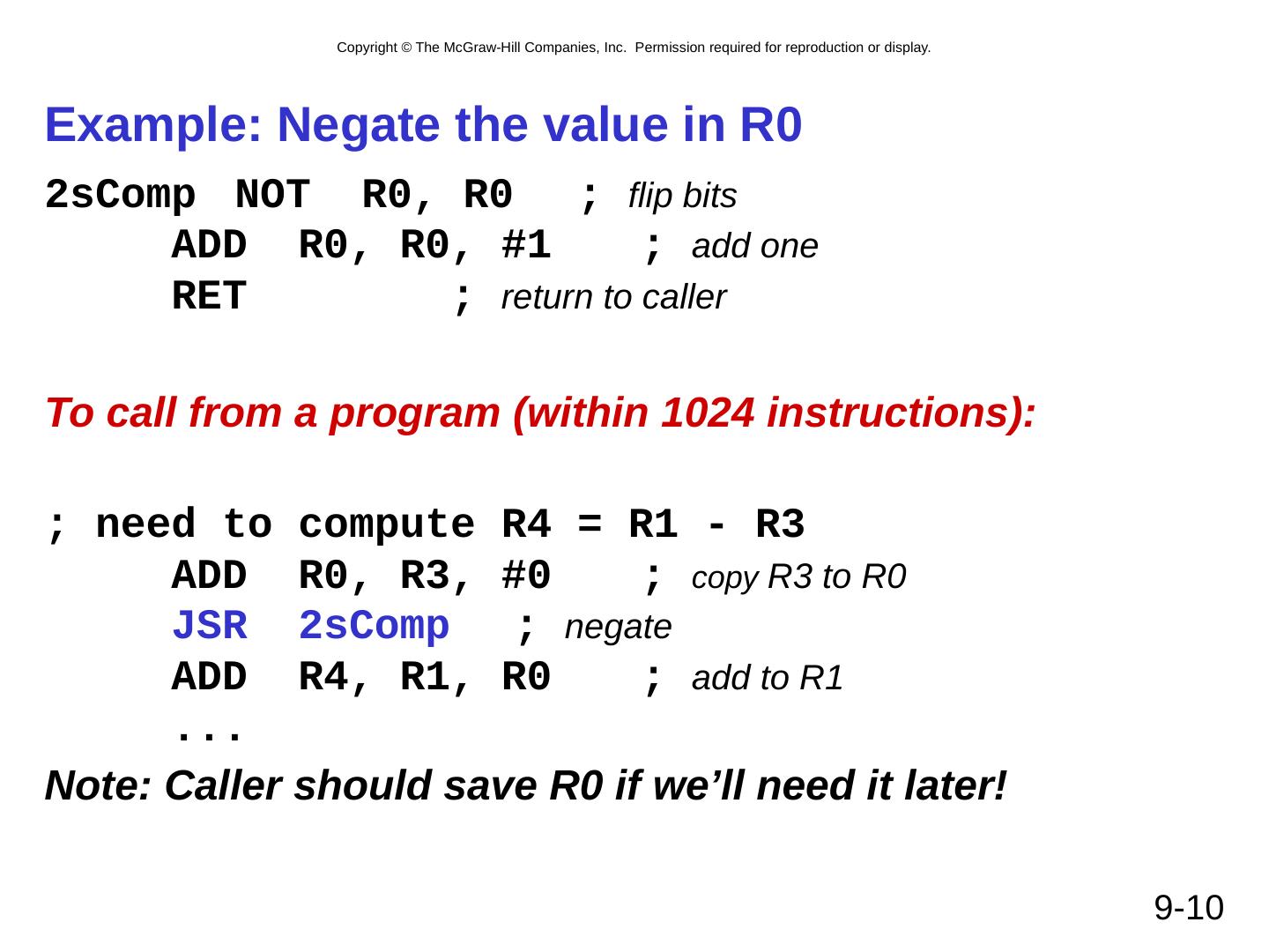 10 .9- 10 Example: Negate the value in R0 2sComp NOT R0, R0 ; flip bits ADD R0, R0, #1 ; add one RET ; return to caller To call from a program (within 1024 instructions): ; need to compute R4 = R1 - R3 ADD R0, R3, #0 ; copy R3 to R0 JSR 2sComp ; negate ADD R4, R1, R0 ; add to R1 ... Note: Caller should save R0 if we’ll need it later!