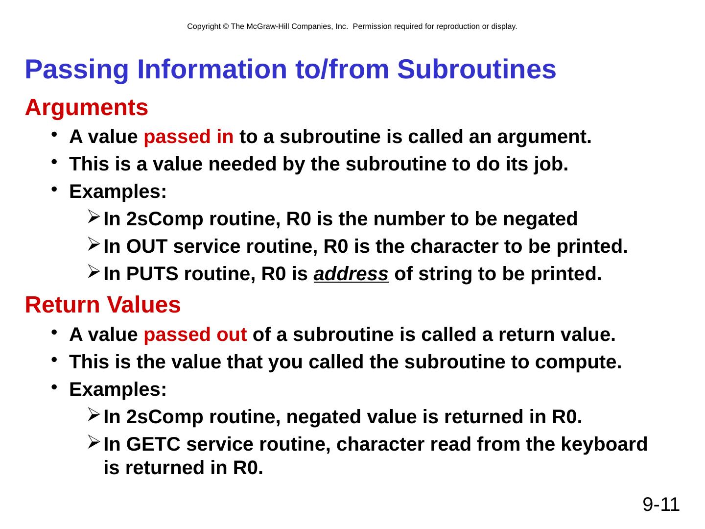 11 .9- 11 Passing Information to/from Subroutines Arguments A value passed in to a subroutine is called an argument. This is a value needed by the subroutine to do its job. Examples: In 2sComp routine, R0 is the number to be negated In OUT service routine, R0 is the character to be printed. In PUTS routine, R0 is address of string to be printed. Return Values A value passed out of a subroutine is called a return value. This is the value that you called the subroutine to compute. Examples: In 2sComp routine, negated value is returned in R0. In GETC service routine, character read from the keyboard is returned in R0.