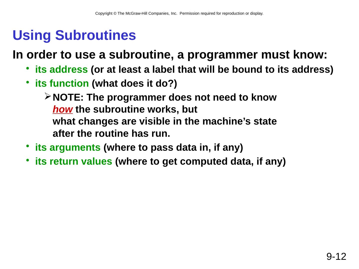 12 .9- 12 Using Subroutines In order to use a subroutine, a programmer must know: its address (or at least a label that will be bound to its address) its function (what does it do?) NOTE: The programmer does not need to know how the subroutine works, but what changes are visible in the machine’s state after the routine has run. its arguments (where to pass data in, if any) its return values (where to get computed data, if any)