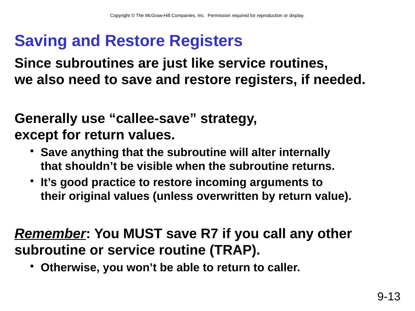8 .9- 8 Saving and Restoring Registers Called routine -- “callee-save” Before start, save any registers that will be altered (unless altered value is desired by calling program!) Before return, restore those same registers Calling routine -- “caller-save” Save registers destroyed by own instructions or by called routines (if known), if values needed later save R7 before TRAP save R0 before TRAP x23 (input character) Or avoid using those registers altogether Values are saved by storing them in memory.
