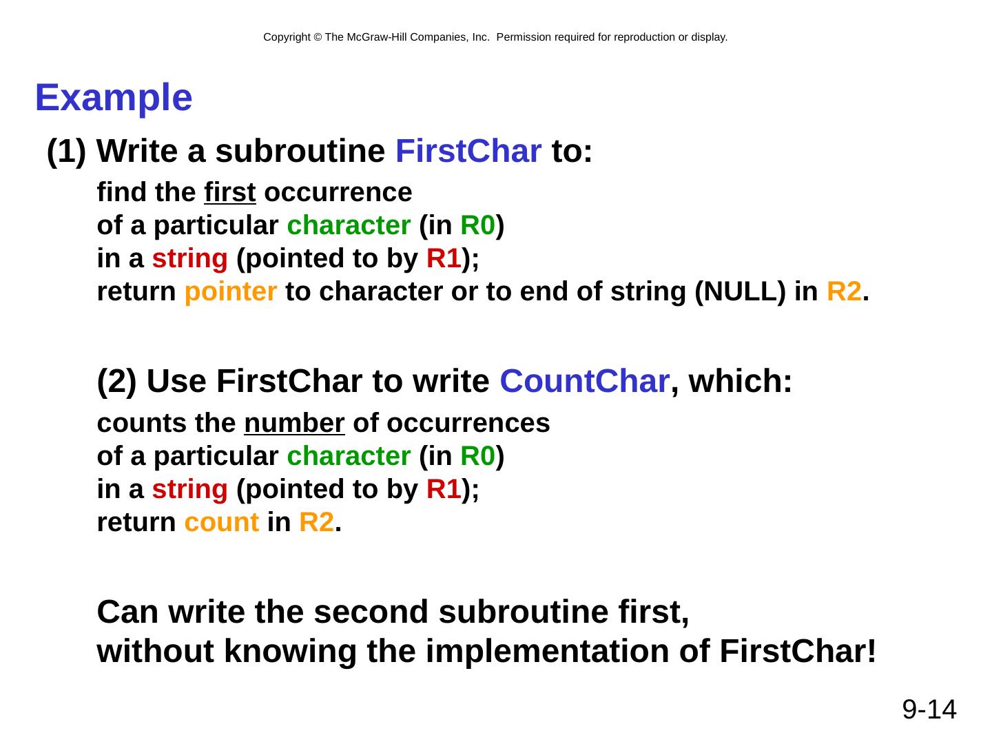 14 .9- 14 Example Write a subroutine FirstChar to: find the first occurrence of a particular character (in R0 ) in a string (pointed to by R1 ); return pointer to character or to end of string (NULL) in R2 . (2) Use FirstChar to write CountChar , which: counts the number of occurrences of a particular character (in R0 ) in a string (pointed to by R1 ); return count in R2 . Can write the second subroutine first, without knowing the implementation of FirstChar!