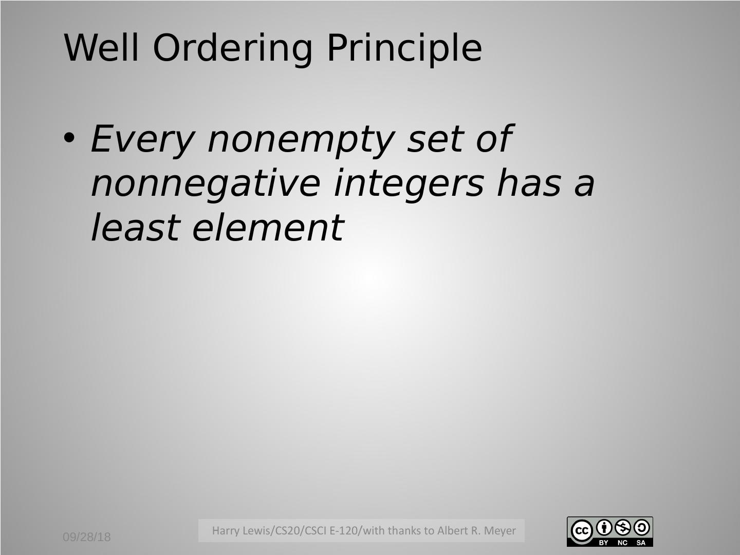 5 .Well Ordering Principle Every nonempty set of nonnegative integers has a least element We actually used this already when arguing that a fraction can be reduced to “lowest terms” The set of factors of a positive integer is nonempty 09/28/18