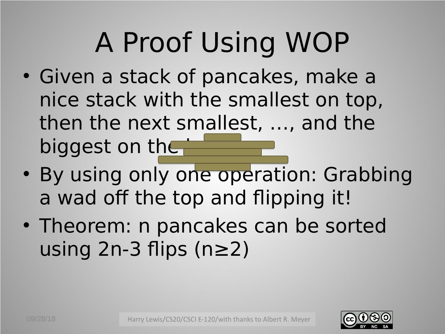 9 . Why does this take 2n-3 flips? • For n≥2, let P(n) := “n pancakes can be sorted using 2n-3 flips” • Suppose this is false for some n • Let C = {n: P(n) is false} • C has a least element by WOP. Call it m. • So m pancakes cannot be sorted using 2m-3 flips and m is the smallest number for which that is the case 09/28/18