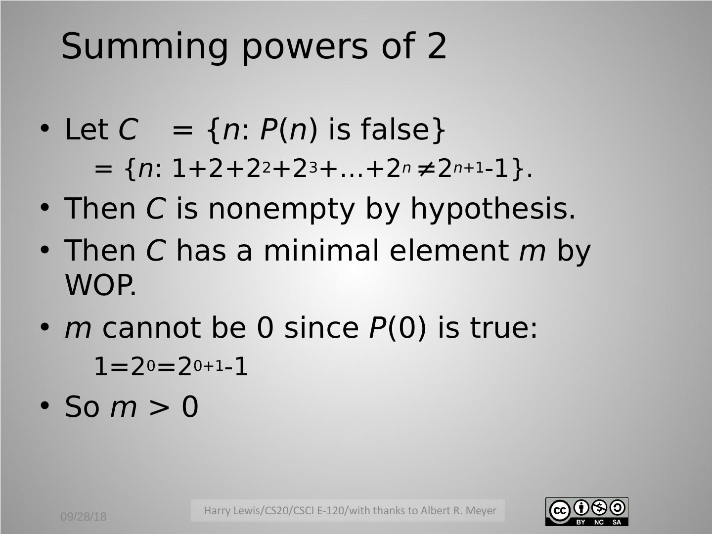 14 . Summing powers of 2 • Let C = {n: P(n) is false} = {n: 1+2+22+23+…+2n ≠2n+1-1}. • Then C is nonempty by hypothesis. • Then C has a minimal element m by WOP. • m cannot be 0 since P(0) is true: 1=20=20+1-1 • So m > 0 09/28/18