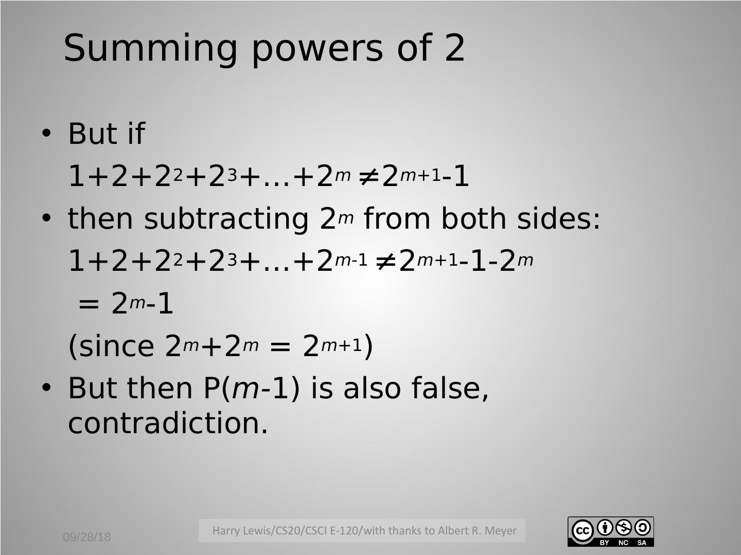 15 . Summing powers of 2 • But if 1+2+22+23+…+2m ≠2m+1-1 • then subtracting 2m from both sides: 1+2+22+23+…+2m-1 ≠2m+1-1-2m = 2m-1 (since 2m+2m = 2m+1) • But then P(m-1) is also false, contradiction. 09/28/18