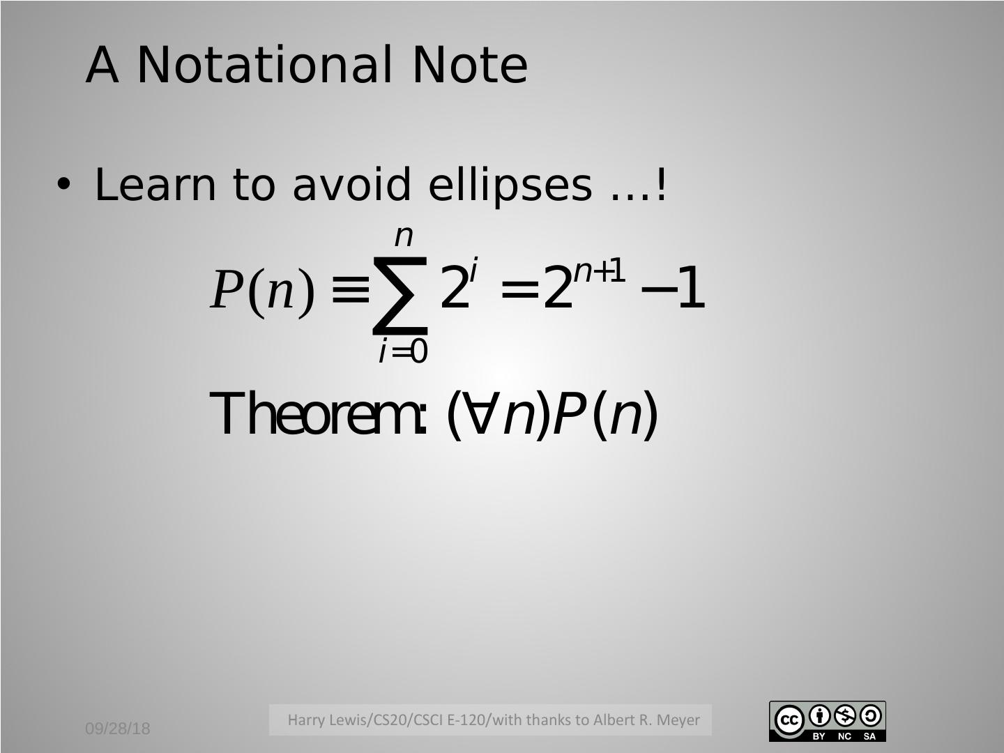 17 . A Notational Note • Learn to avoid ellipses …! n P(n) ≡∑ 2 =2i n+1 −1 i=0 Theorem: (∀n)P(n) 09/28/18