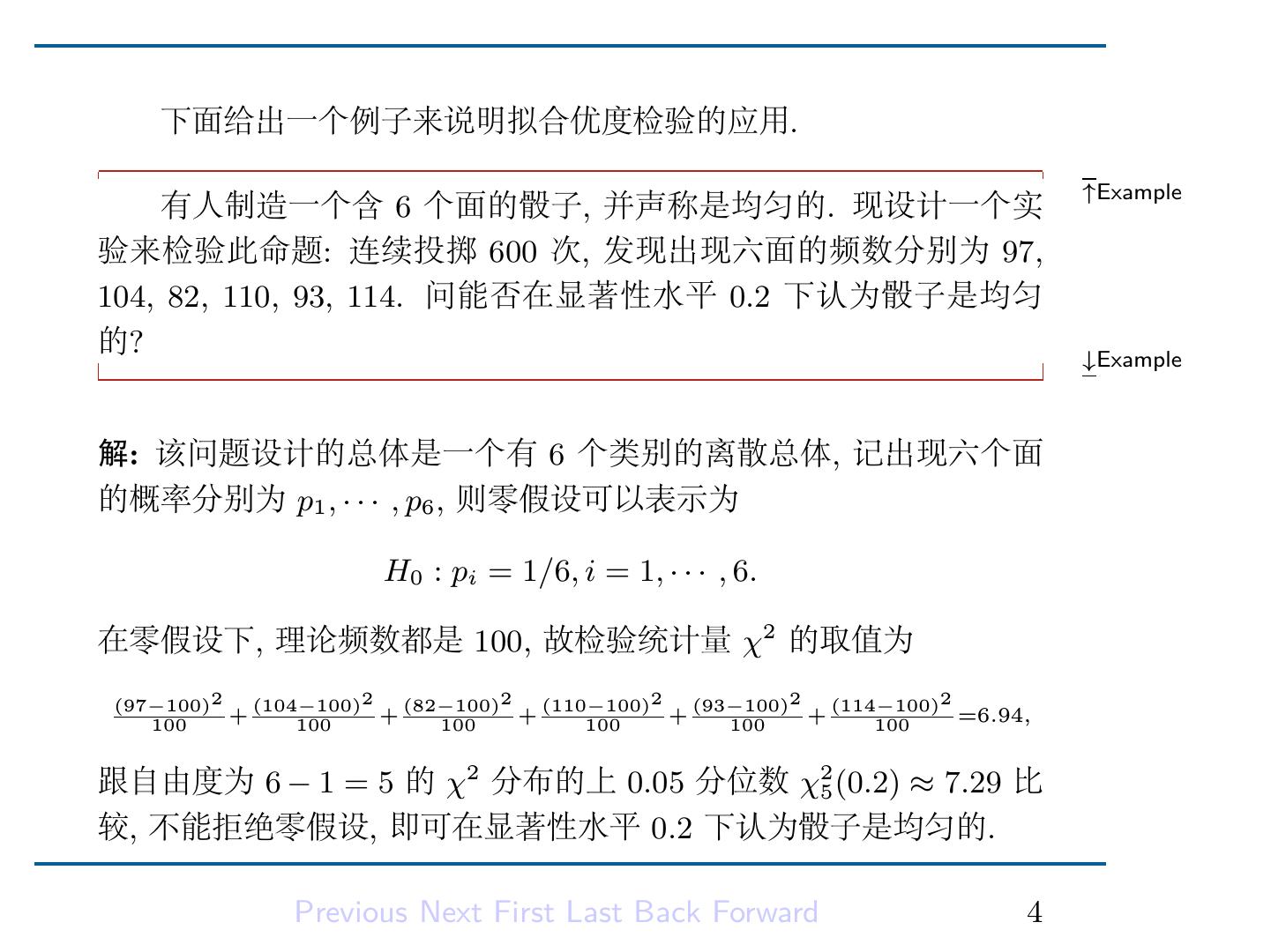 6 . 下面给出一个例子来说明拟合优度检验的应用. ↑Example 有人制造一个含 6 个面的骰子, 并声称是均匀的. 现设计一个实 验来检验此命题: 连续投掷 600 次, 发现出现六面的频数分别为 97, 104, 82, 110, 93, 114. 问能否在显著性水平 0.2 下认为骰子是均匀 的? ↓Example 解: 该问题设计的总体是一个有 6 个类别的离散总体, 记出现六个面 的概率分别为 p1 , · · · , p6 , 则零假设可以表示为 H0 : pi = 1/6, i = 1, · · · , 6. 在零假设下, 理论频数都是 100, 故检验统计量 χ2 的取值为 (97−100)2 (104−100)2 (82−100)2 (110−100)2 (93−100)2 (114−100)2 100 + 100 + 100 + 100 + 100 + 100 =6.94, 跟自由度为 6 − 1 = 5 的 χ2 分布的上 0.05 分位数 χ25 (0.2) ≈ 7.29 比 较, 不能拒绝零假设, 即可在显著性水平 0.2 下认为骰子是均匀的. Previous Next First Last Back Forward 4