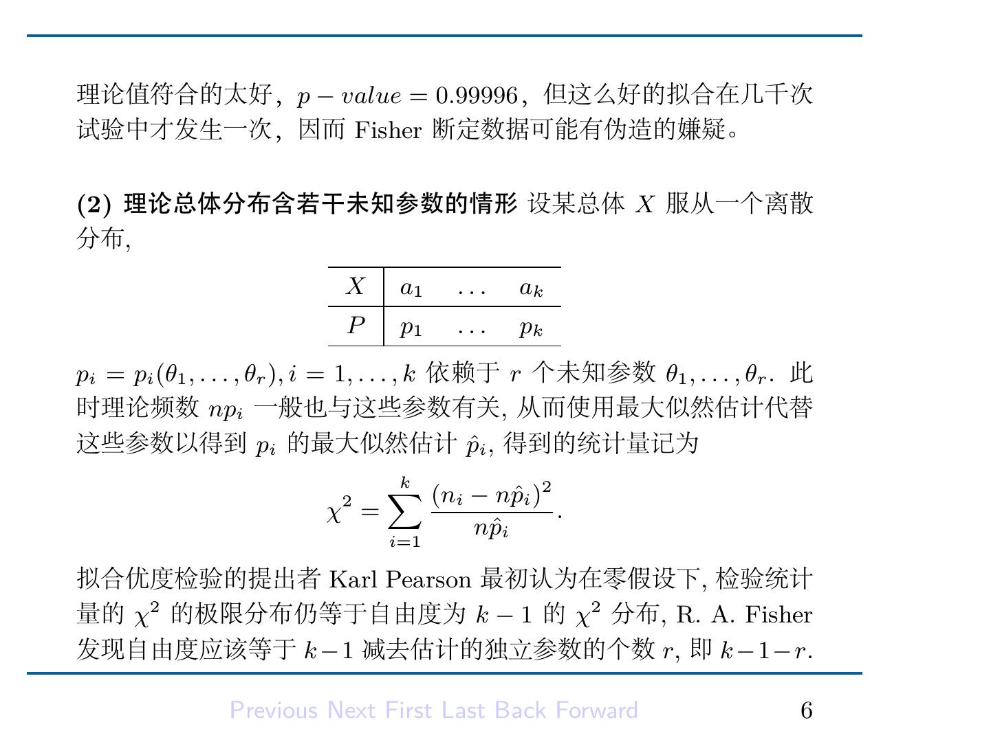 8 .理论值符合的太好,p − value = 0.99996,但这么好的拟合在几千次 试验中才发生一次,因而 Fisher 断定数据可能有伪造的嫌疑。 (2) 理论总体分布含若干未知参数的情形 设某总体 X 服从一个离散 分布, X a1 ... ak P p1 ... pk pi = pi (θ1 , . . . , θr ), i = 1, . . . , k 依赖于 r 个未知参数 θ1 , . . . , θr . 此 时理论频数 npi 一般也与这些参数有关, 从而使用最大似然估计代替 这些参数以得到 pi 的最大似然估计 pˆi , 得到的统计量记为 ∑k (ni − nˆpi )2 χ2 = . i=1 nˆ pi 拟合优度检验的提出者 Karl Pearson 最初认为在零假设下, 检验统计 量的 χ2 的极限分布仍等于自由度为 k − 1 的 χ2 分布, R. A. Fisher 发现自由度应该等于 k −1 减去估计的独立参数的个数 r, 即 k −1−r. Previous Next First Last Back Forward 6
