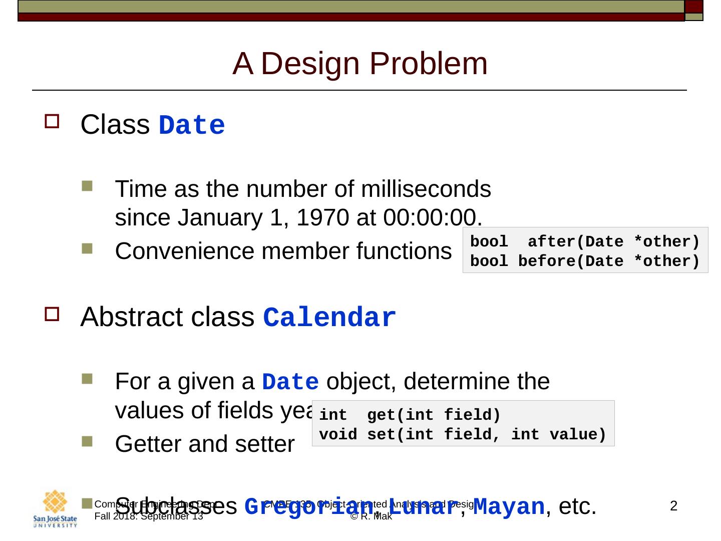 2 .A Design Problem Class Date Time as the number of milliseconds since January 1, 1970 at 00:00:00. Convenience member functions Abstract class Calendar For a given a Date object, determine the values of fields year, month, and day. Getter and setter Subclasses Gregorian , Lunar , Mayan , etc. 2 bool after(Date *other) bool before(Date *other) int get( int field) void set( int field, int value)