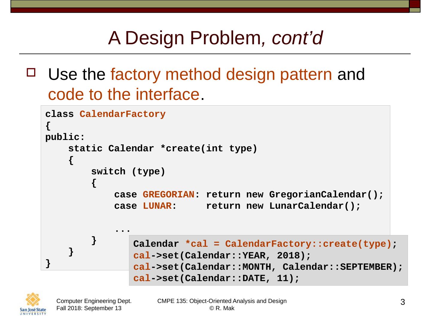 3 .A Design Problem , cont’d Use the factory method design pattern and code to the interface . 3 class CalendarFactory { public: static Calendar *create( int type) { switch (type) { case GREGORIAN : return new GregorianCalendar (); case LUNAR : return new LunarCalendar (); ... } } } Calendar * cal = CalendarFactory ::create(type) ; cal ->set(Calendar::YEAR, 2018); cal ->set(Calendar::MONTH, Calendar::SEPTEMBER); cal ->set(Calendar::DATE, 11);