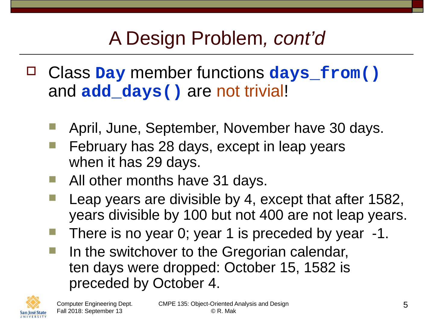 5 .A Design Problem , cont’d Class Day member functions days_from () and add_days () are not trivial ! April, June, September, November have 30 days. February has 28 days, except in leap years when it has 29 days. All other months have 31 days. Leap years are divisible by 4, except that after 1582, years divisible by 100 but not 400 are not leap years. There is no year 0; year 1 is preceded by year -1. In the switchover to the Gregorian calendar, ten days were dropped: October 15, 1582 is preceded by October 4. 5