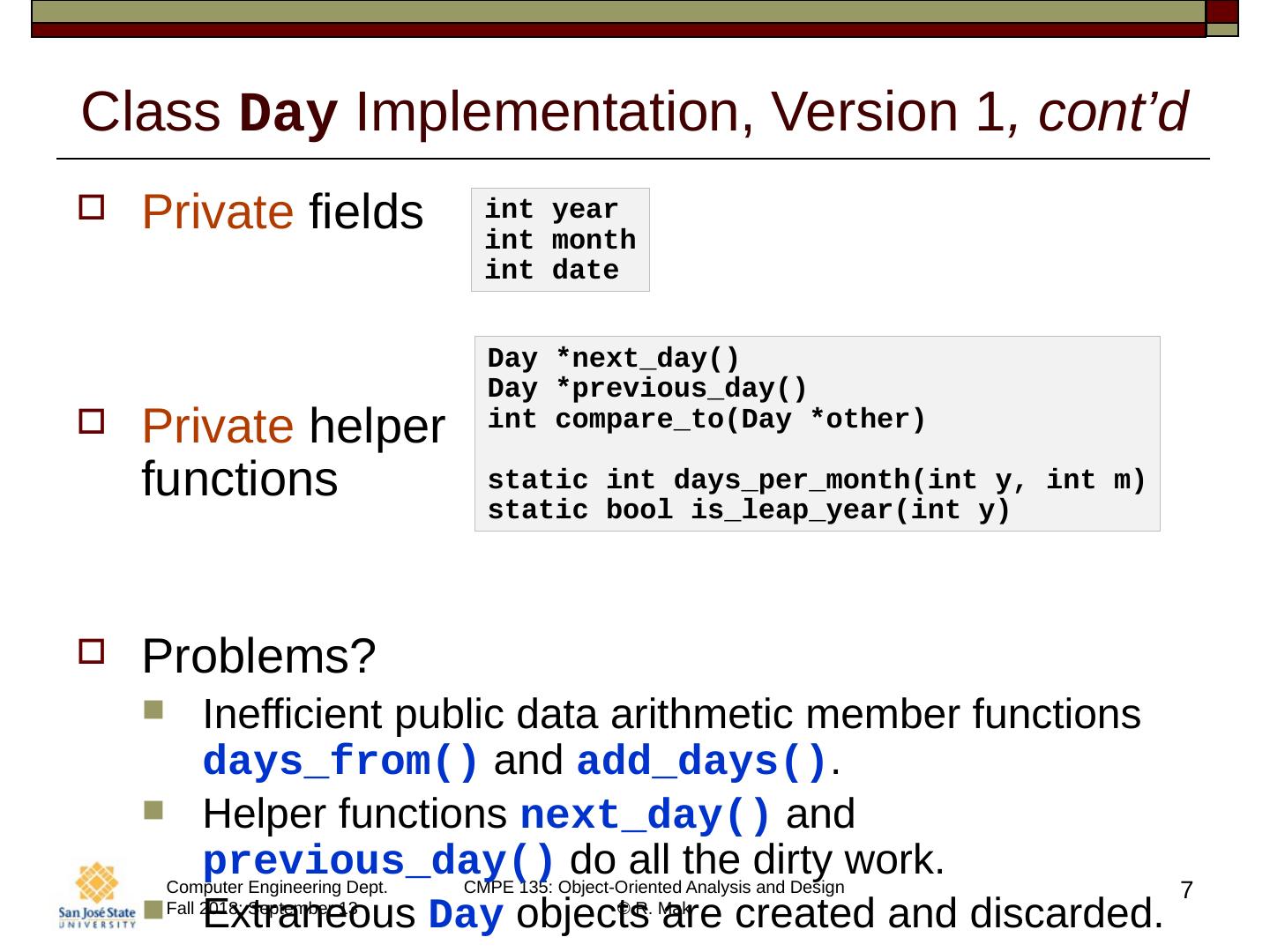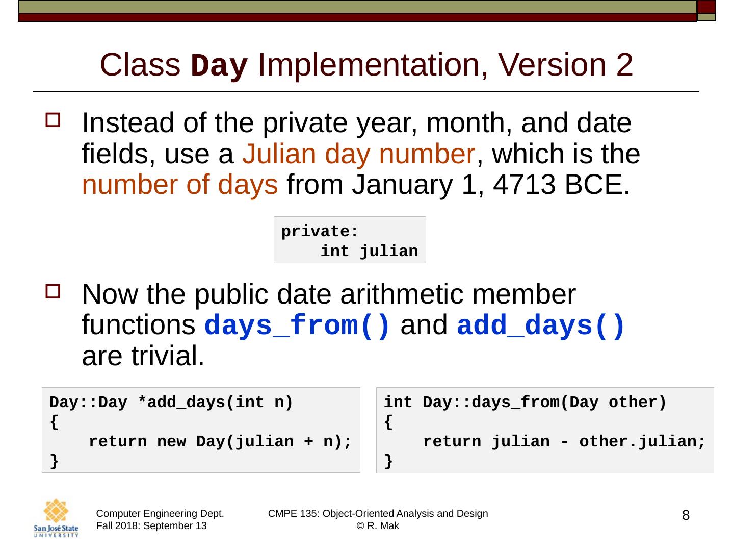8 .8 Class Day Implementation, Version 2 Instead of the private year, month, and date fields, use a Julian day number , which is the number of days from January 1, 4713 BCE. Now the public date arithmetic member functions days_from () and add_days () are trivial. private: int julian Day::Day * add_days ( int n) { return new Day( julian + n); } int Day:: days_from (Day other) { return julian - other.julian ; }