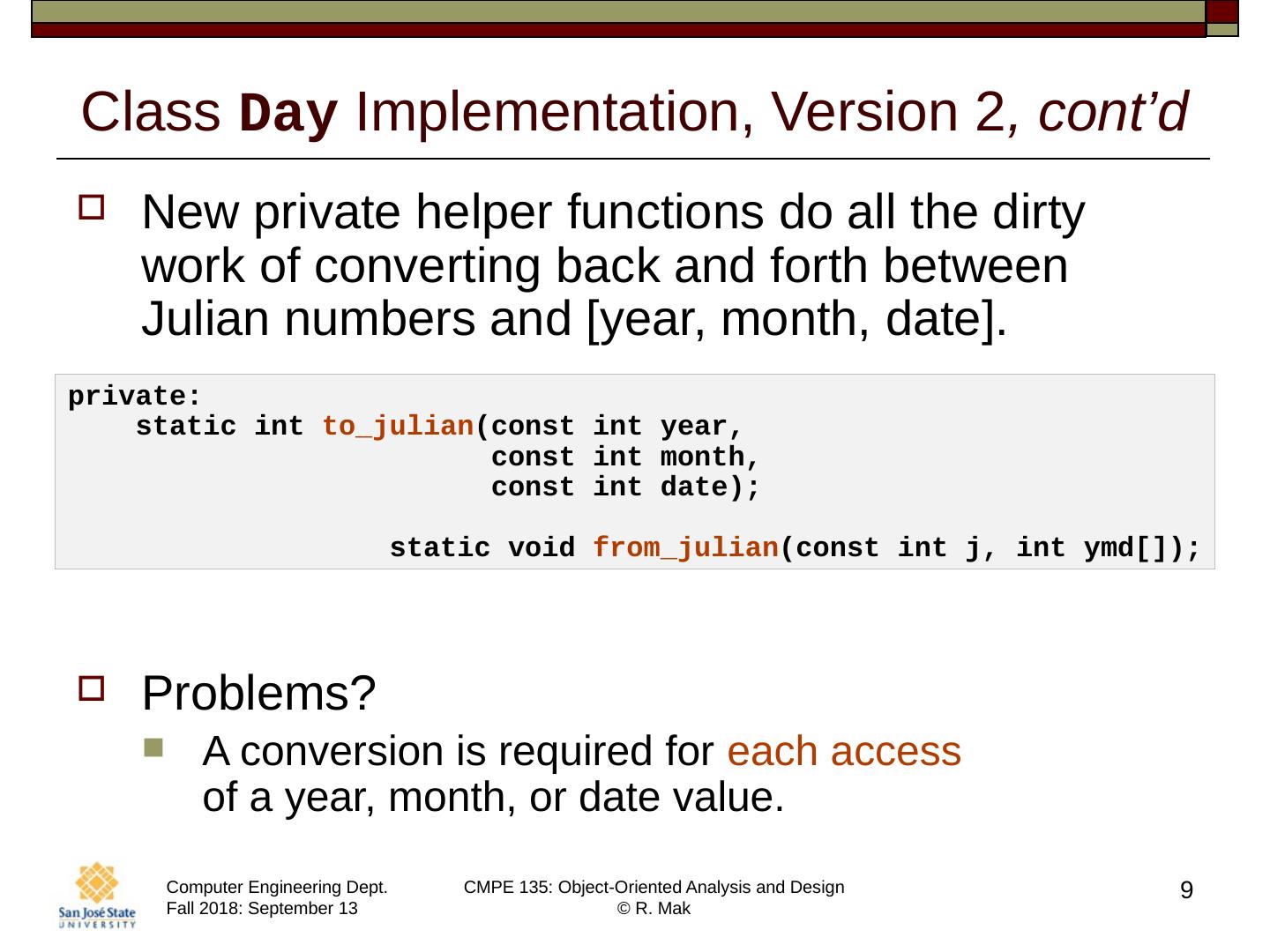 9 .9 Class Day Implementation, Version 2 , cont’d New private helper functions do all the dirty work of converting back and forth between Julian numbers and [year, month, date]. Problems? A conversion is required for each access of a year, month, or date value. private: static int to_julian ( const int year, const int month, const int date); static void from_julian ( const int j, int ymd []);