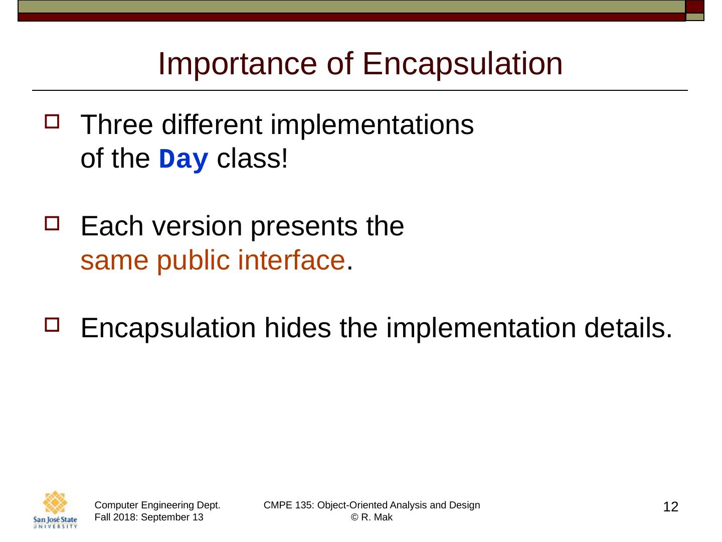 12 .12 Importance of Encapsulation Three different implementations of the Day class! Each version presents the same public interface . Encapsulation hides the implementation details.