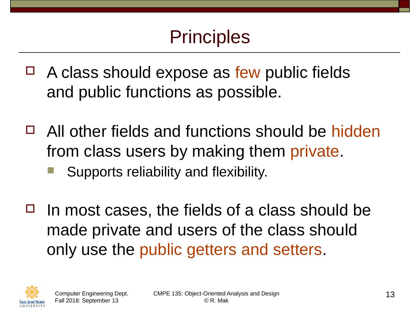 13 .13 Principles A class should expose as few public fields and public functions as possible. All other fields and functions should be hidden from class users by making them private . Supports reliability and flexibility. In most cases, the fields of a class should be made private and users of the class should only use the public getters and setters .