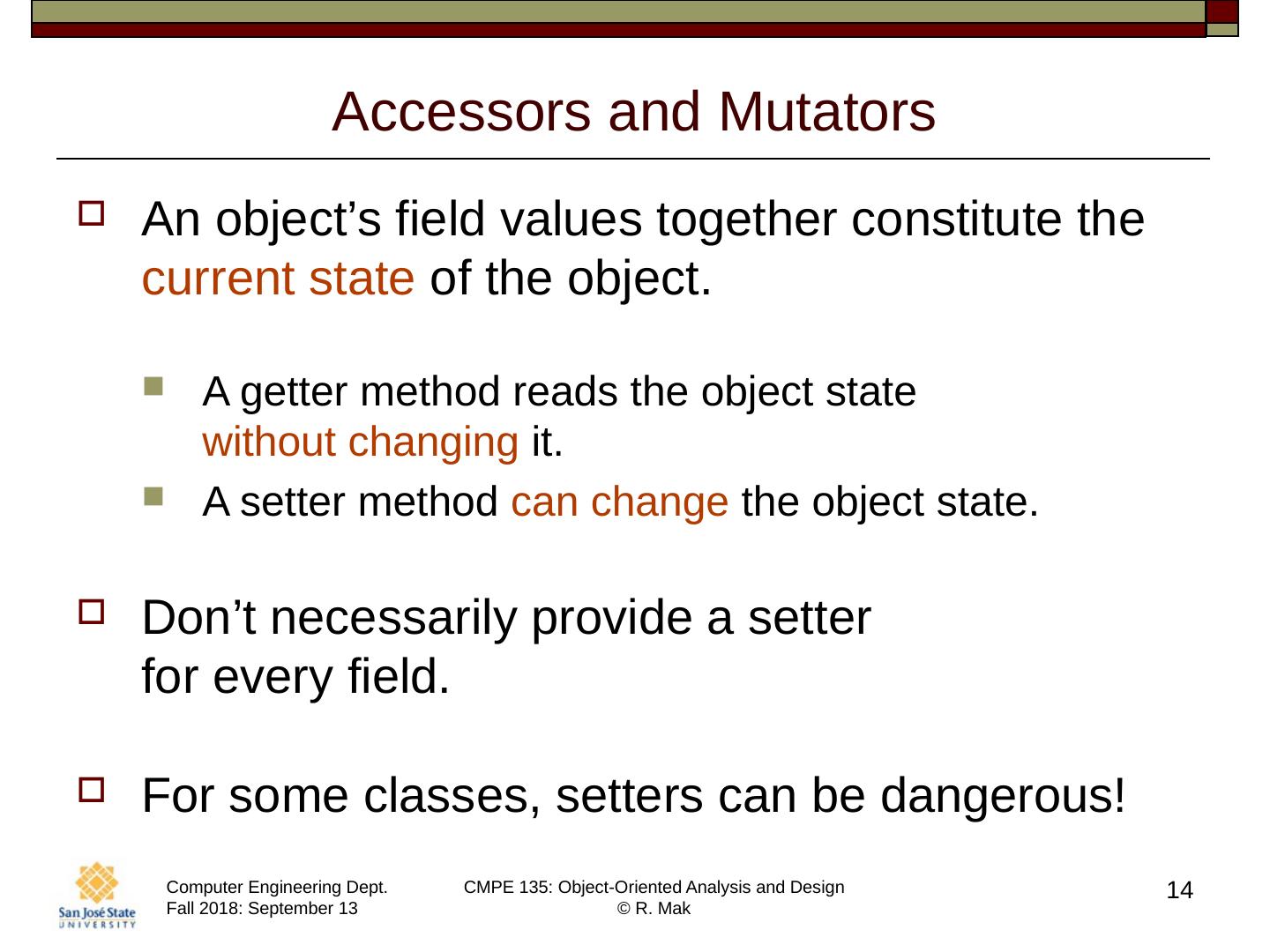 14 .14 Accessors and Mutators An object’s field values together constitute the current state of the object. A getter method reads the object state without changing it. A setter method can change the object state. Don’t necessarily provide a setter for every field. For some classes, setters can be dangerous!
