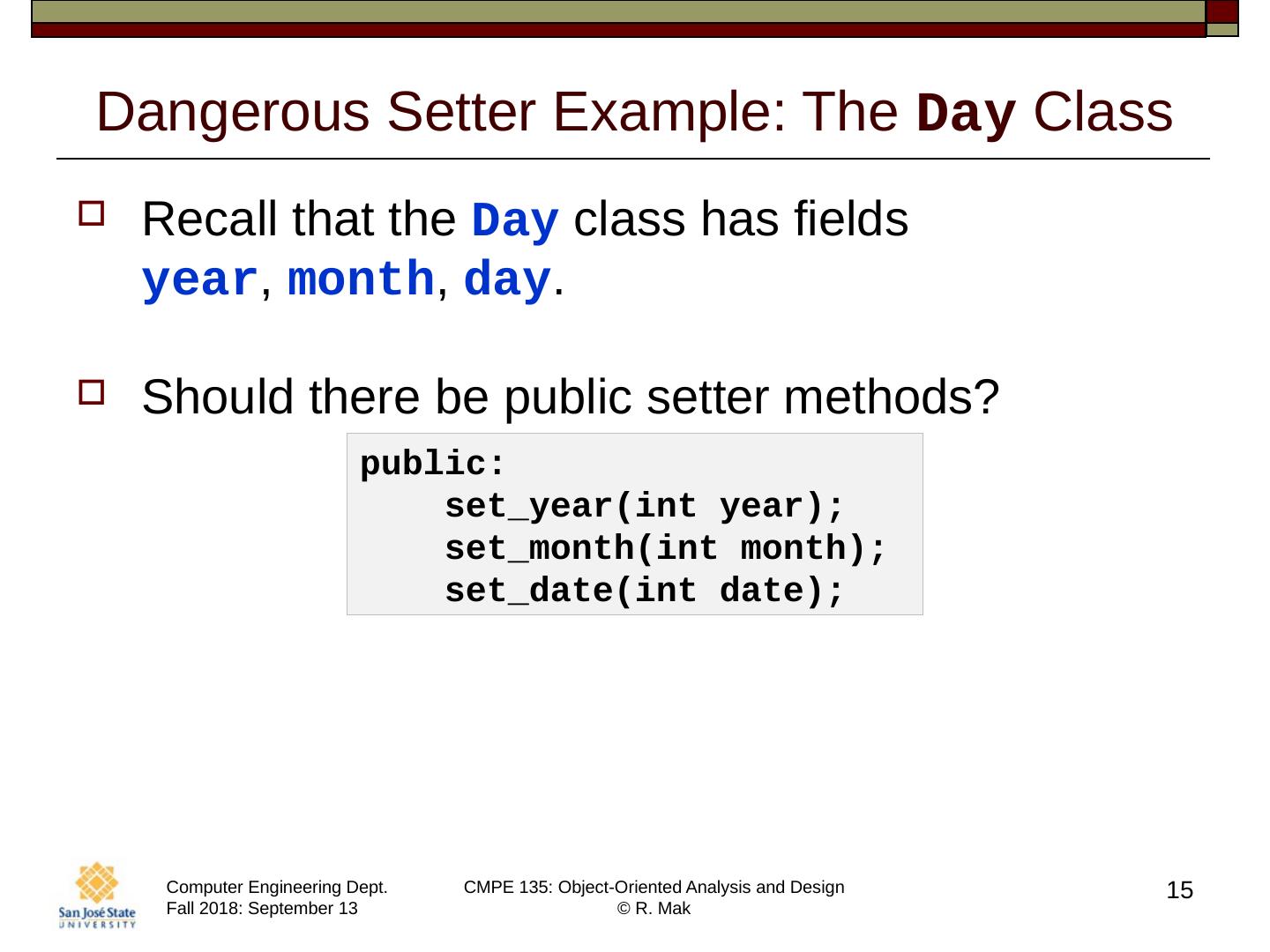 15 .15 Dangerous Setter Example: The Day Class Recall that the Day class has fields year , month , day . Should there be public setter methods? public: set_year ( int year); set_month ( int month); set_date ( int date);