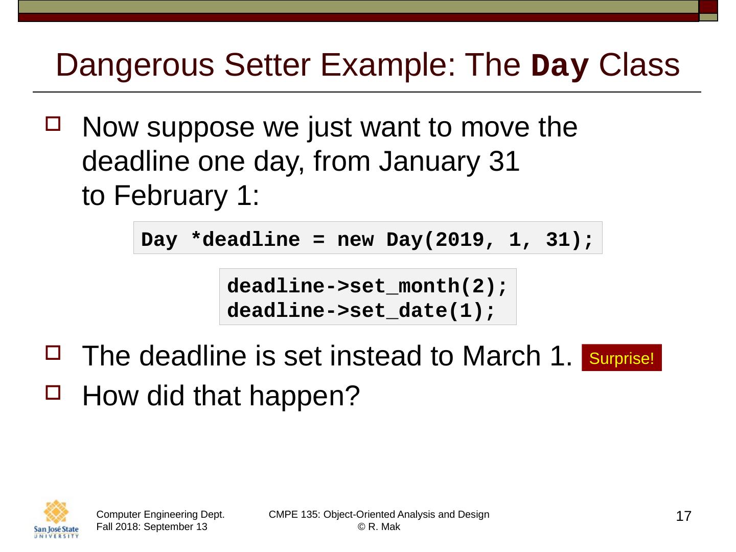 17 .17 Dangerous Setter Example: The Day Class Now suppose we just want to move the deadline one day, from January 31 to February 1: The deadline is set instead to March 1. How did that happen? deadline-> set_month (2); deadline-> set_date (1); Surprise! Day *deadline = new Day( 2019 , 1, 31);