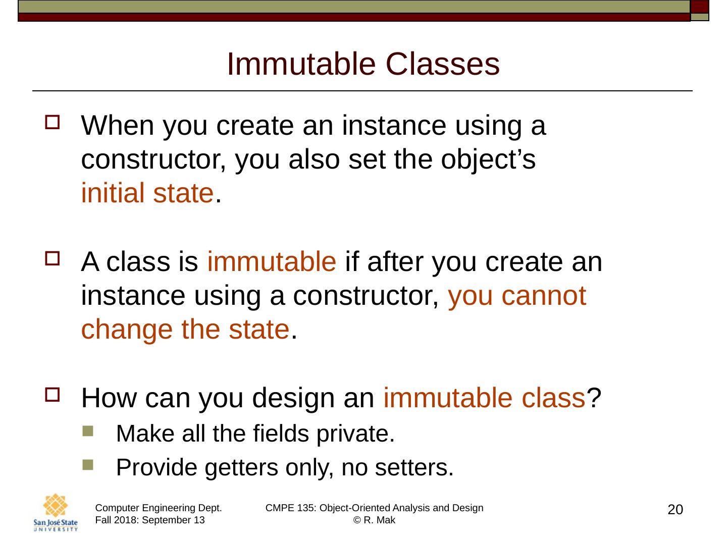 20 .20 Immutable Classes When you create an instance using a constructor, you also set the object’s initial state . A class is immutable if after you create an instance using a constructor, you cannot change the state . How can you design an immutable class ? Make all the fields private. Provide getters only, no setters.