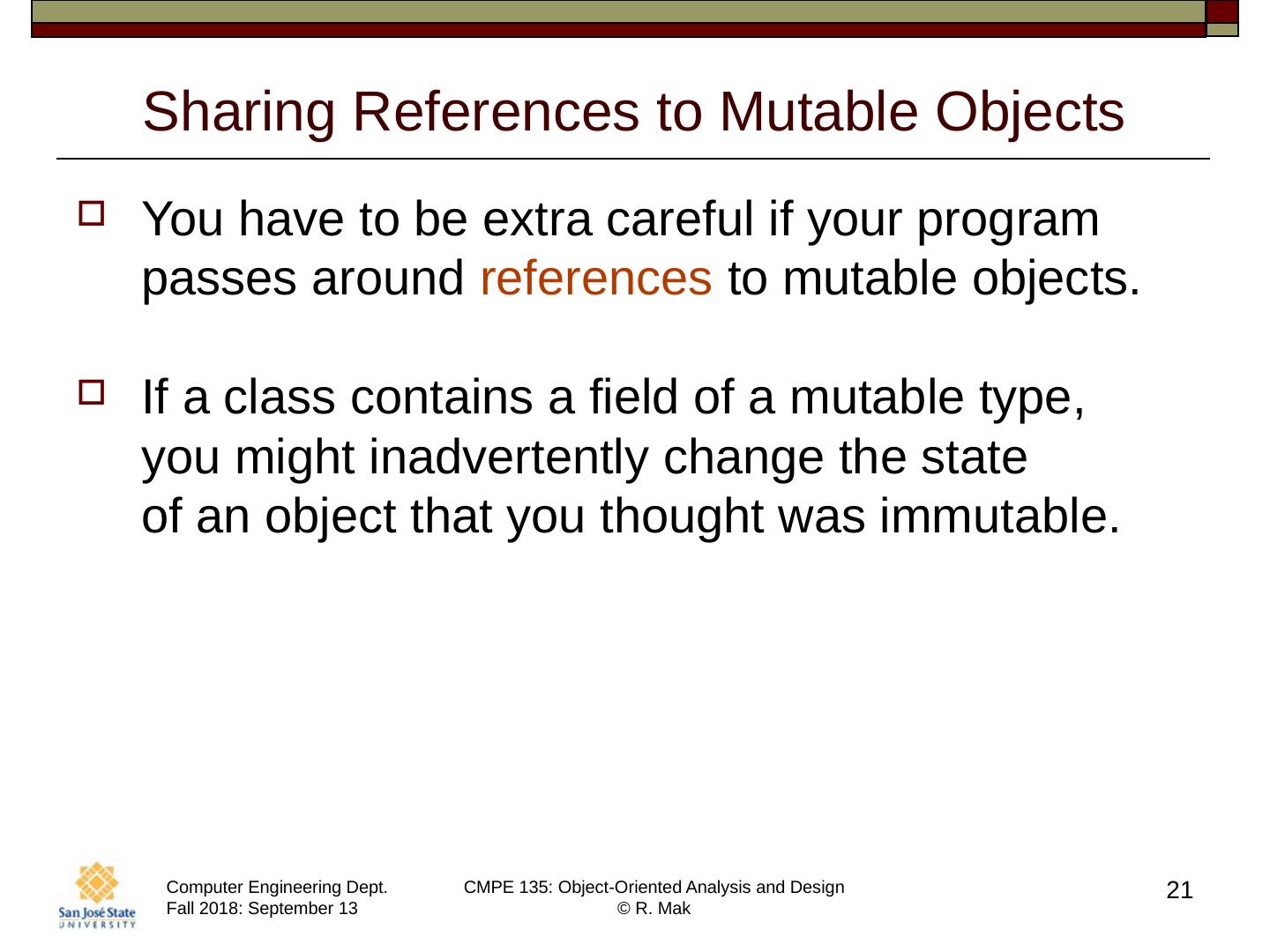 21 .21 Sharing References to Mutable Objects You have to be extra careful if your program passes around references to mutable objects. If a class contains a field of a mutable type, you might inadvertently change the state of an object that you thought was immutable.