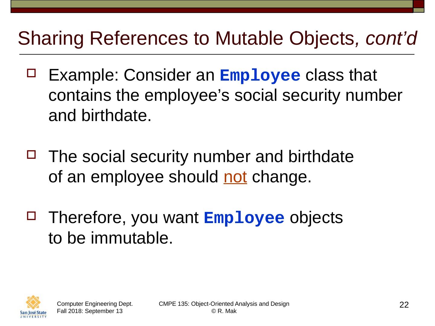 22 .22 Sharing References to Mutable Objects , cont’d Example: Consider an Employee class that contains the employee’s social security number and birthdate. The social security number and birthdate of an employee should not change. Therefore, you want Employee objects to be immutable.