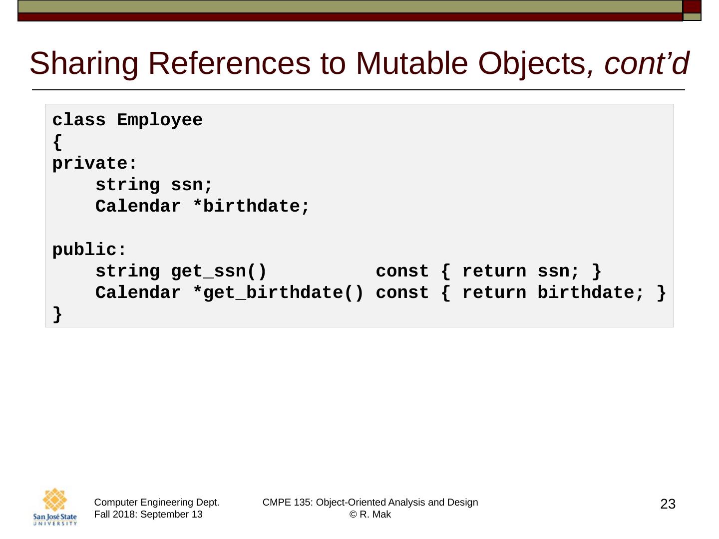 23 .23 class Employee { private: string ssn ; Calendar *birthdate; public: string get_ssn () const { return ssn ; } Calendar * get_birthdate () const { return birthdate; } } Sharing References to Mutable Objects , cont’d