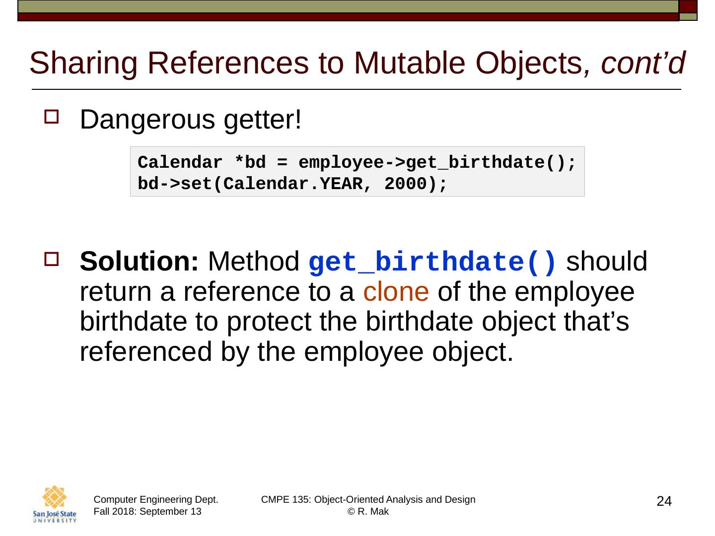 24 .24 Dangerous getter! Solution: Method get_birthdate () should return a reference to a clone of the employee birthdate to protect the birthdate object that’s referenced by the employee object. Calendar * bd = employee-> get_birthdate (); bd ->set( Calendar.YEAR , 2000); Sharing References to Mutable Objects , cont’d