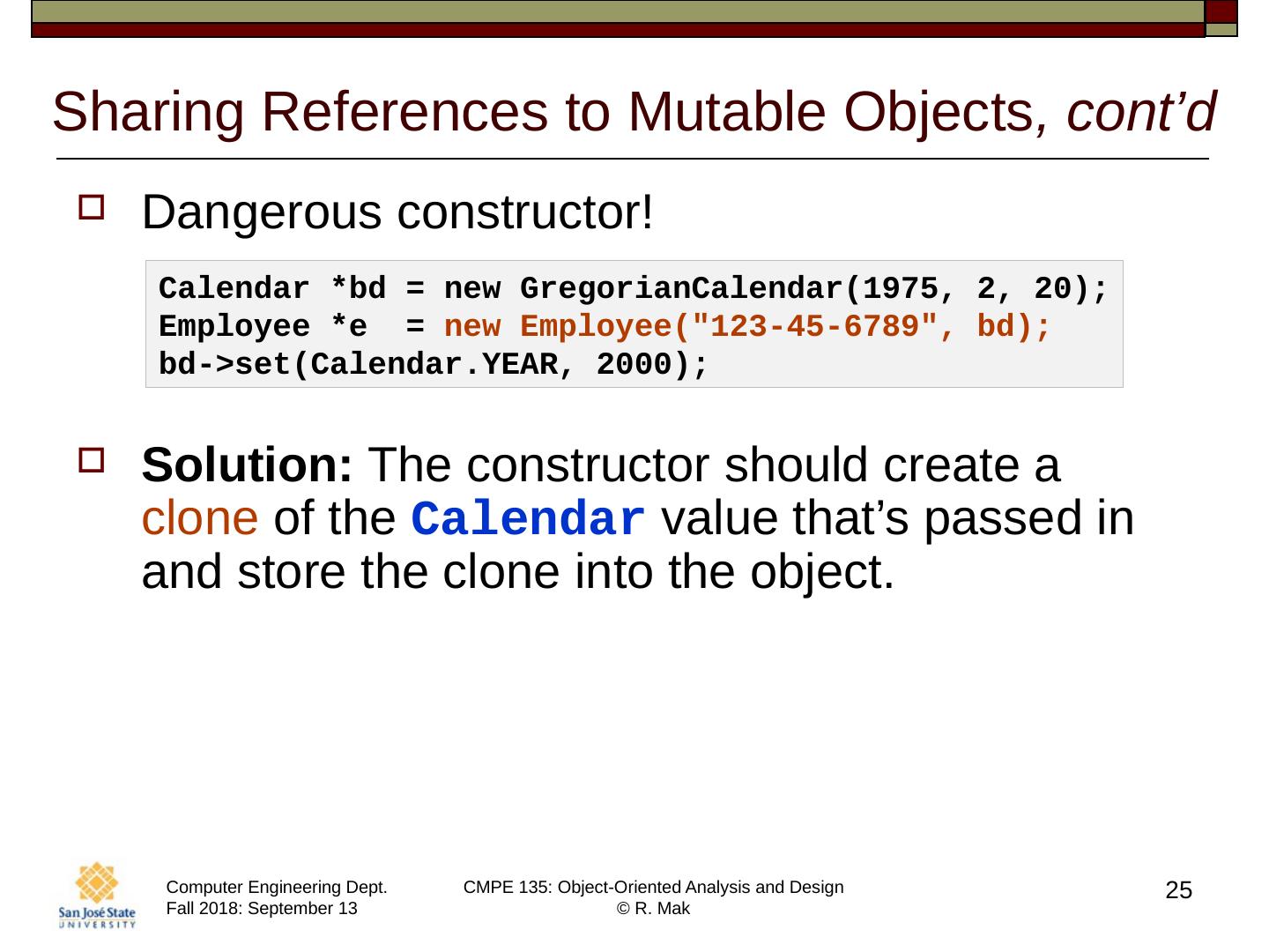 25 .25 Dangerous constructor! Solution: The constructor should create a clone of the Calendar value that’s passed in and store the clone into the object. Calendar * bd = new GregorianCalendar (1975, 2, 20); Employee *e = new Employee( " 123-45-6789 " , bd ); bd ->set( Calendar.YEAR , 2000); Sharing References to Mutable Objects , cont’d
