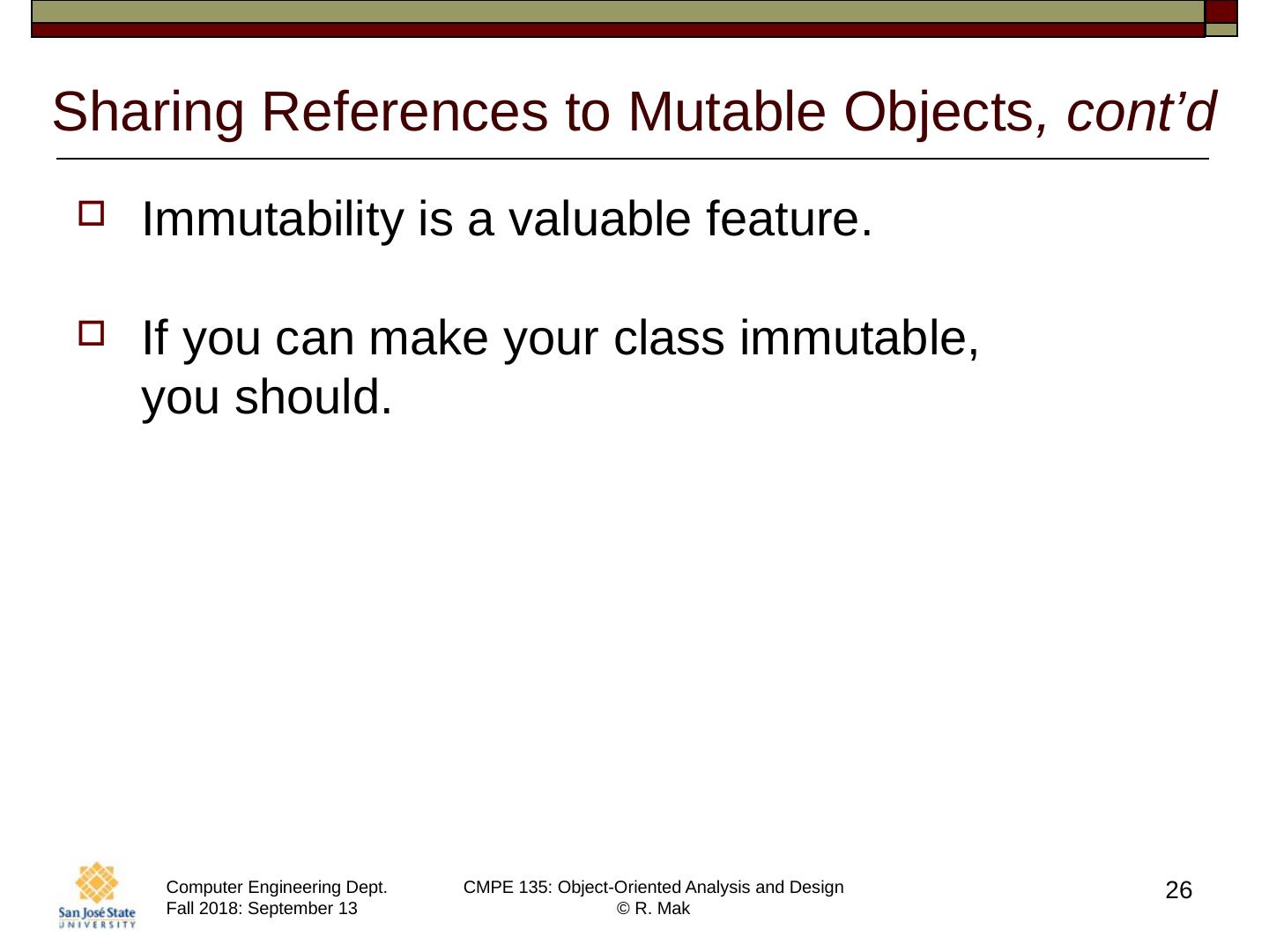 26 .Immutability is a valuable feature. If you can make your class immutable, you should. 26 Sharing References to Mutable Objects , cont’d