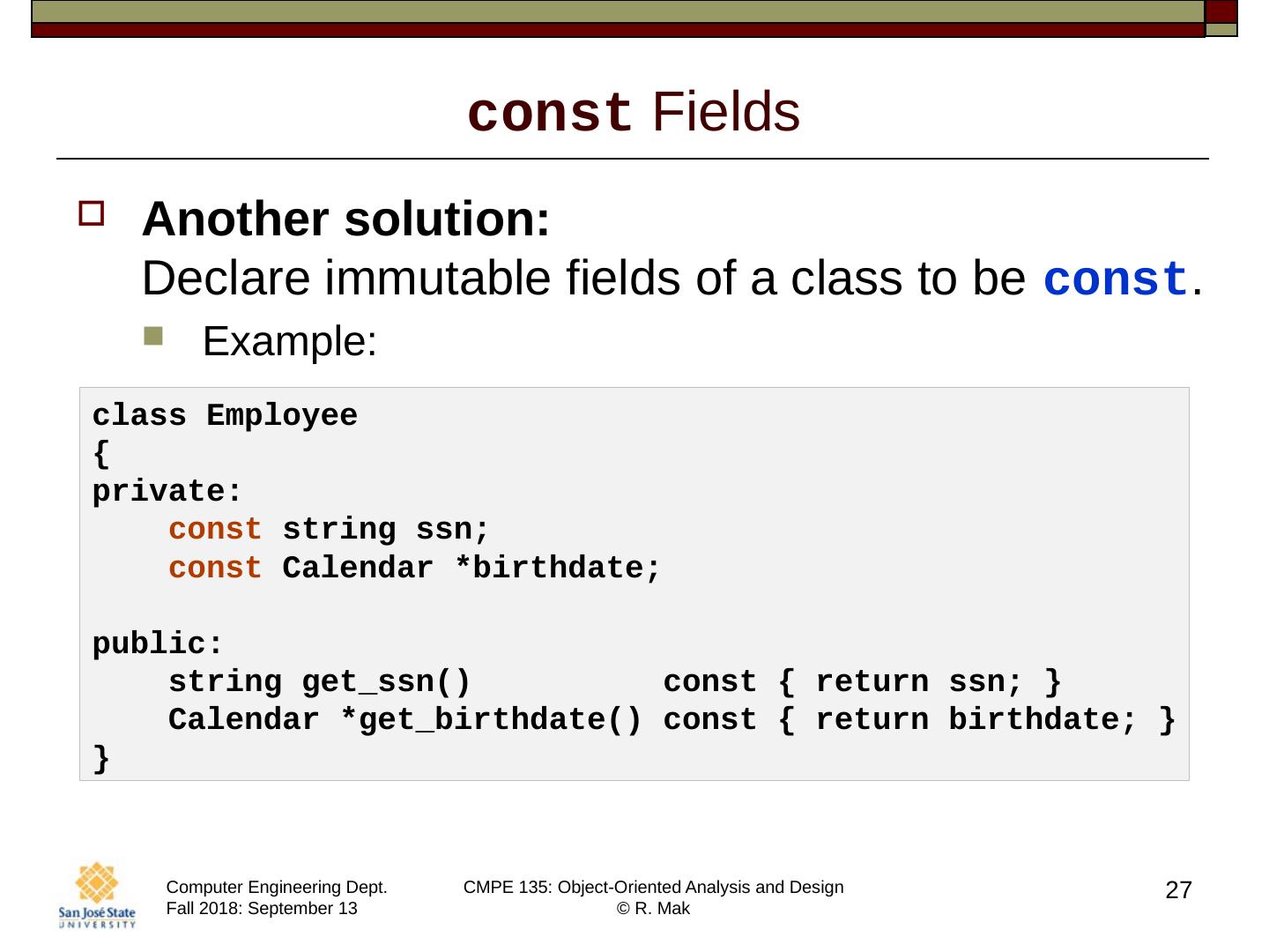 27 .27 const Fields Another solution: Declare immutable fields of a class to be const . Example: class Employee { private: const string ssn ; const Calendar *birthdate; public: string get_ssn () const { return ssn ; } Calendar * get_birthdate () const { return birthdate; } }