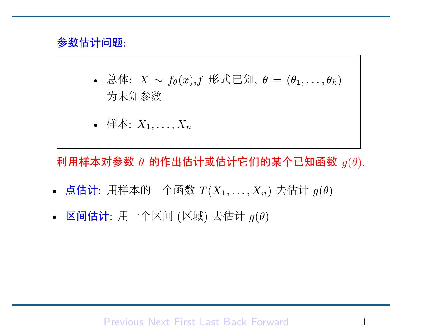 3 . 参数估计问题: • 总体: X ∼ fθ (x),f 形式已知, θ = (θ1 , . . . , θk ) 为未知参数 • 样本: X1 , . . . , Xn 利用样本对参数 θ 的作出估计或估计它们的某个已知函数 g(θ). • 点估计: 用样本的一个函数 T (X1 , . . . , Xn ) 去估计 g(θ) • 区间估计: 用一个区间 (区域) 去估计 g(θ) Previous Next First Last Back Forward 1