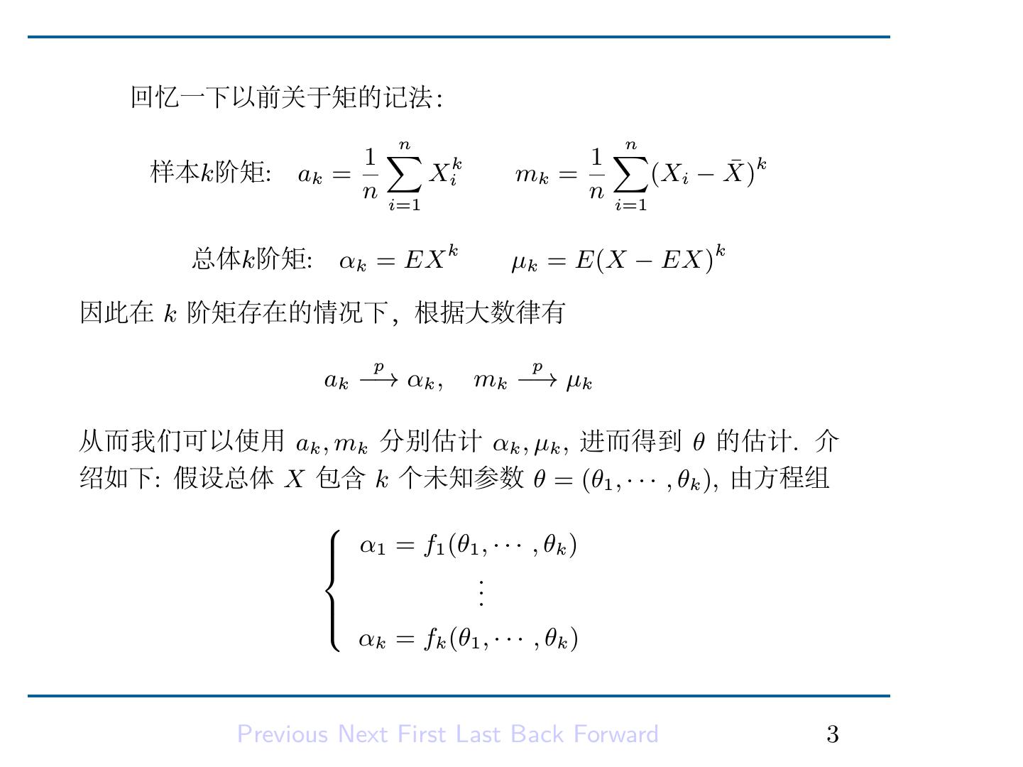 5 . 回忆一下以前关于矩的记法: 1∑ k 1∑ n n 样本k阶矩: ak = Xi mk = (Xi − X) ¯ k n i=1 n i=1 总体k阶矩: αk = EX k µk = E(X − EX)k 因此在 k 阶矩存在的情况下,根据大数律有 p p ak −→ αk , mk −→ µk 从而我们可以使用 ak , mk 分别估计 αk , µk , 进而得到 θ 的估计. 介 绍如下: 假设总体 X 包含 k 个未知参数 θ = (θ1 , · · · , θk ), 由方程组 α1 = f1 (θ1 , · · · , θk ) .. . αk = fk (θ1 , · · · , θk ) Previous Next First Last Back Forward 3