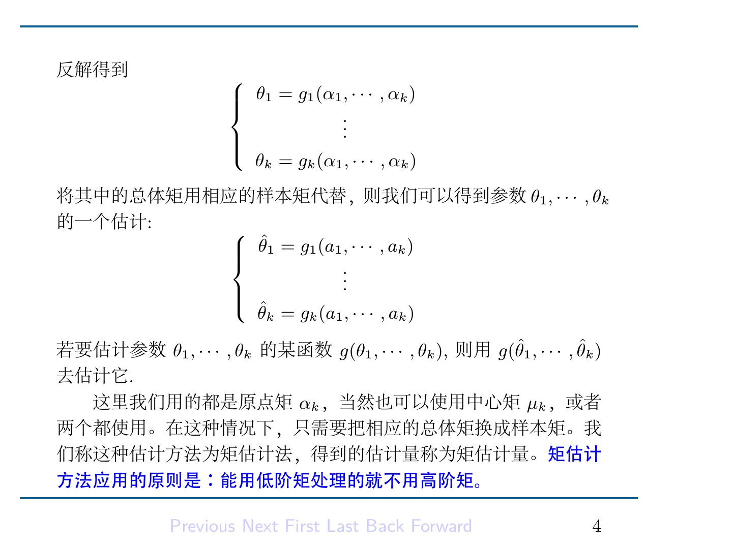 6 .反解得到 θ1 = g1 (α1 , · · · , αk ) .. . θk = gk (α1 , · · · , αk ) 将其中的总体矩用相应的样本矩代替,则我们可以得到参数 θ1 , · · · , θk 的一个估计: θˆ1 = g1 (a1 , · · · , ak ) .. . ˆ θk = gk (a1 , · · · , ak ) 若要估计参数 θ1 , · · · , θk 的某函数 g(θ1 , · · · , θk ), 则用 g(θˆ1 , · · · , θˆk ) 去估计它. 这里我们用的都是原点矩 αk ,当然也可以使用中心矩 µk ,或者 两个都使用。在这种情况下,只需要把相应的总体矩换成样本矩。我 们称这种估计方法为矩估计法,得到的估计量称为矩估计量。矩估计 方法应用的原则是:能用低阶矩处理的就不用高阶矩。 Previous Next First Last Back Forward 4