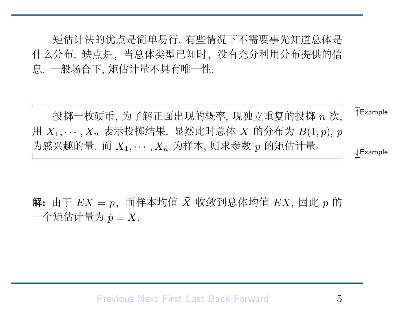 7 . 矩估计法的优点是简单易行, 有些情况下不需要事先知道总体是 什么分布. 缺点是,当总体类型已知时,没有充分利用分布提供的信 息. 一般场合下, 矩估计量不具有唯一性. ↑Example 投掷一枚硬币, 为了解正面出现的概率, 现独立重复的投掷 n 次, 用 X1 , · · · , Xn 表示投掷结果. 显然此时总体 X 的分布为 B(1, p), p 为感兴趣的量. 而 X1 , · · · , Xn 为样本, 则求参数 p 的矩估计量。 ↓Example ¯ 收敛到总体均值 EX, 因此 p 的 解: 由于 EX = p,而样本均值 X ¯ 一个矩估计量为 pˆ = X. Previous Next First Last Back Forward 5