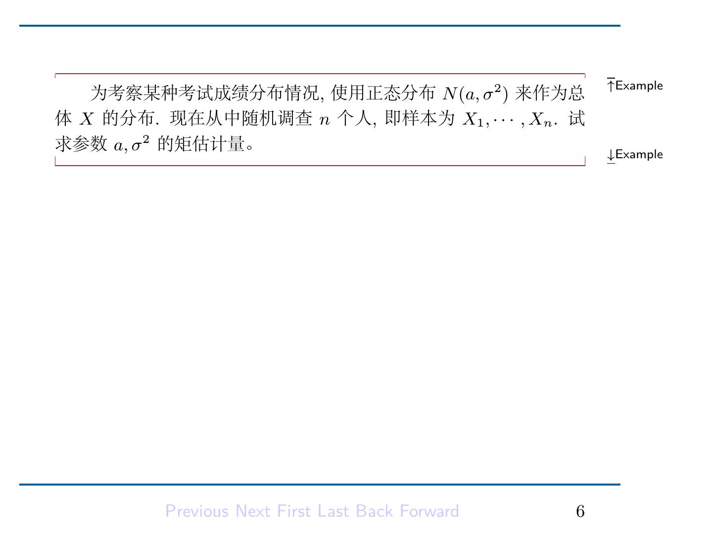 2 .第六章: 参数估计 6.1 点估计 . . . . . . . . . . . . . . . . . . . . . . 2 6.1.1 矩估计方法 . . . . . . . . . . . . . . . 2 6.1.2 最大似然估计方法 . . . . . . . . . . . 7 6.1.3 点估计的优良准则 . . . . . . . . . . . 20 Previous Next First Last Back Forward 1