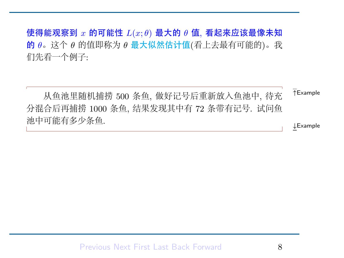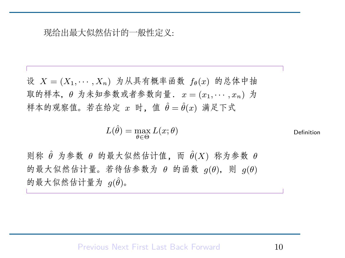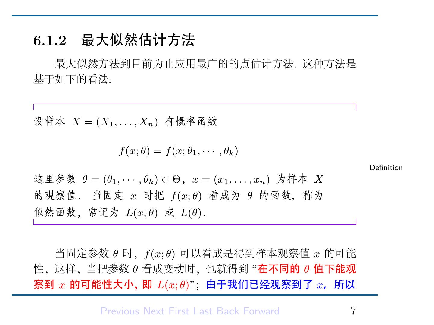 9 .6.1.2 最大似然估计方法 最大似然方法到目前为止应用最广的的点估计方法. 这种方法是 基于如下的看法: 设样本 X = (X1 , . . . , Xn ) 有概率函数 f (x; θ) = f (x; θ1 , · · · , θk ) Definition 这里参数 θ = (θ1 , · · · , θk ) ∈ Θ, x = (x1 , . . . , xn ) 为样本 X 的观察值. 当固定 x 时把 f (x; θ) 看成为 θ 的函数,称为 似然函数, 常记为 L(x; θ) 或 L(θ). 当固定参数 θ 时,f (x; θ) 可以看成是得到样本观察值 x 的可能 性,这样,当把参数 θ 看成变动时,也就得到 “在不同的 θ 值下能观 察到 x 的可能性大小, 即 L(x; θ)”;由于我们已经观察到了 x,所以 Previous Next First Last Back Forward 7