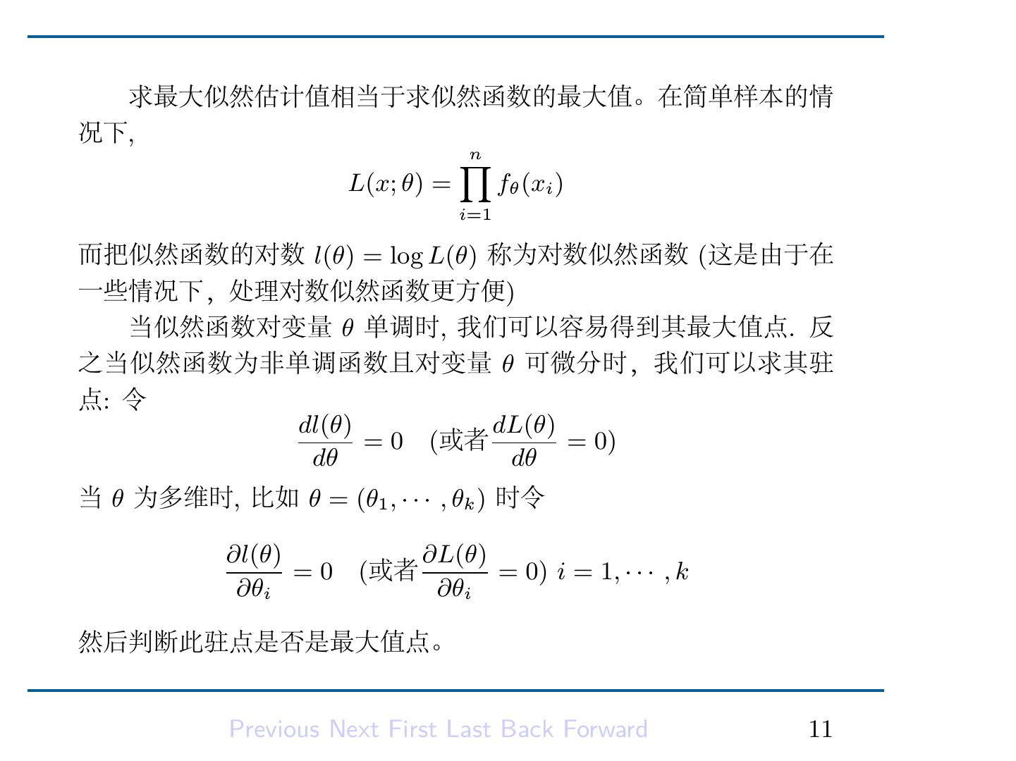 13 . 求最大似然估计值相当于求似然函数的最大值。在简单样本的情 况下, ∏ n L(x; θ) = fθ (xi ) i=1 而把似然函数的对数 l(θ) = log L(θ) 称为对数似然函数 (这是由于在 一些情况下,处理对数似然函数更方便) 当似然函数对变量 θ 单调时, 我们可以容易得到其最大值点. 反 之当似然函数为非单调函数且对变量 θ 可微分时,我们可以求其驻 点: 令 dl(θ) dL(θ) = 0 (或者 = 0) dθ dθ 当 θ 为多维时, 比如 θ = (θ1 , · · · , θk ) 时令 ∂l(θ) ∂L(θ) =0 (或者 = 0) i = 1, · · · , k ∂θi ∂θi 然后判断此驻点是否是最大值点。 Previous Next First Last Back Forward 11