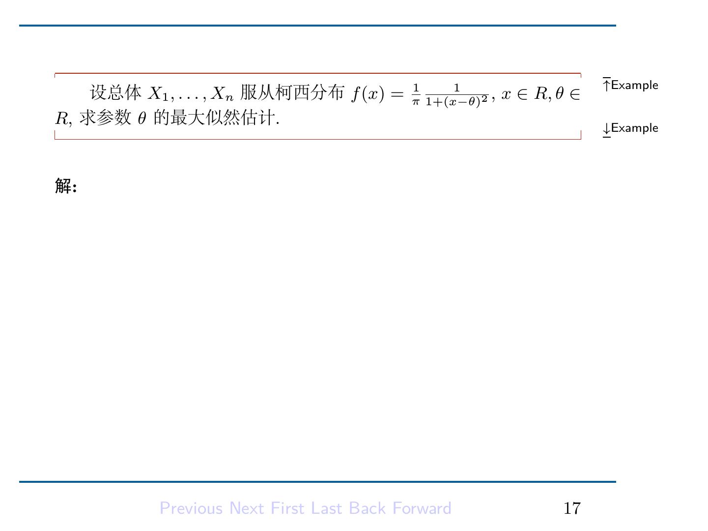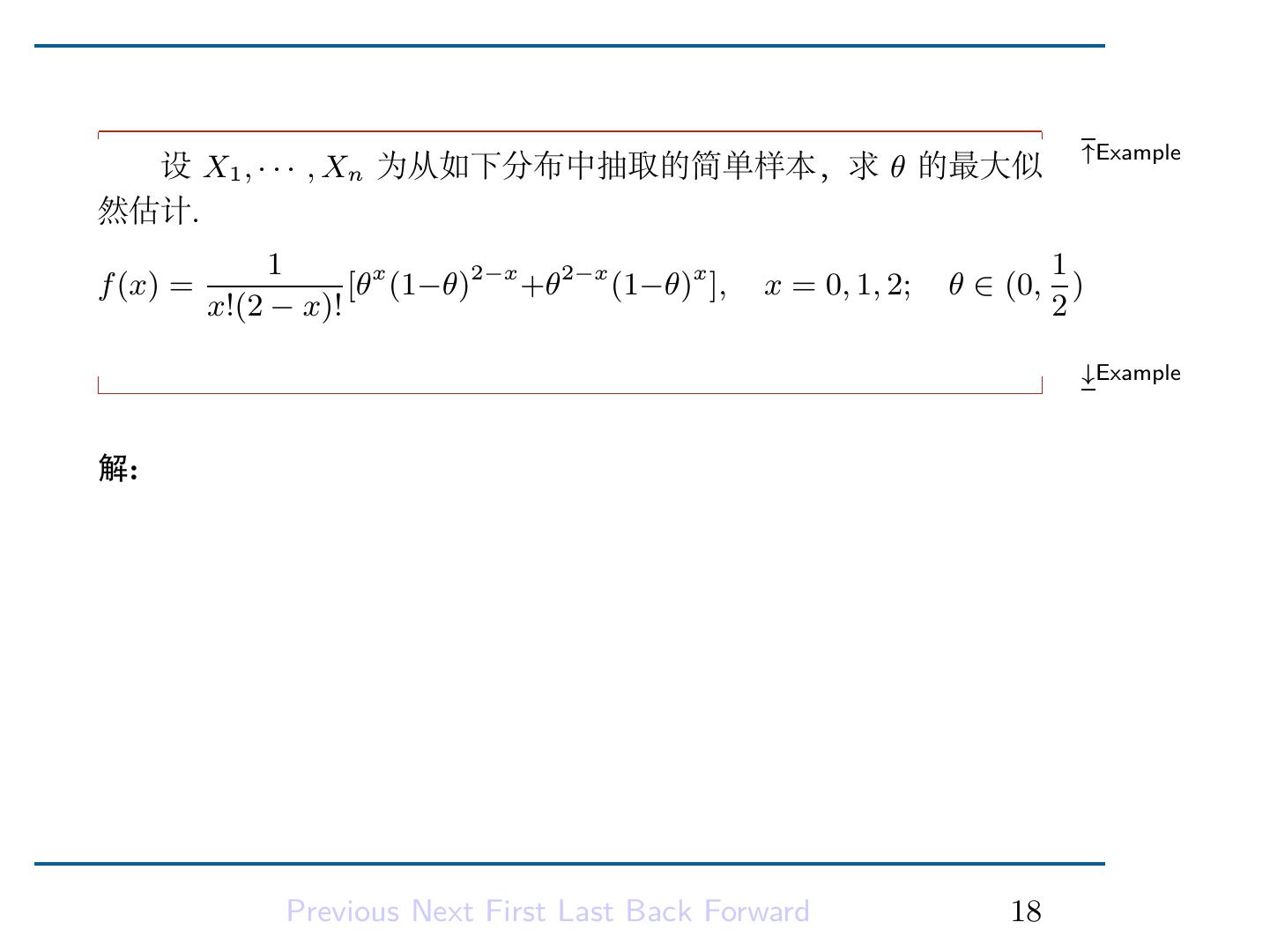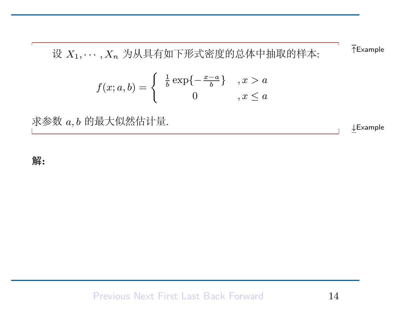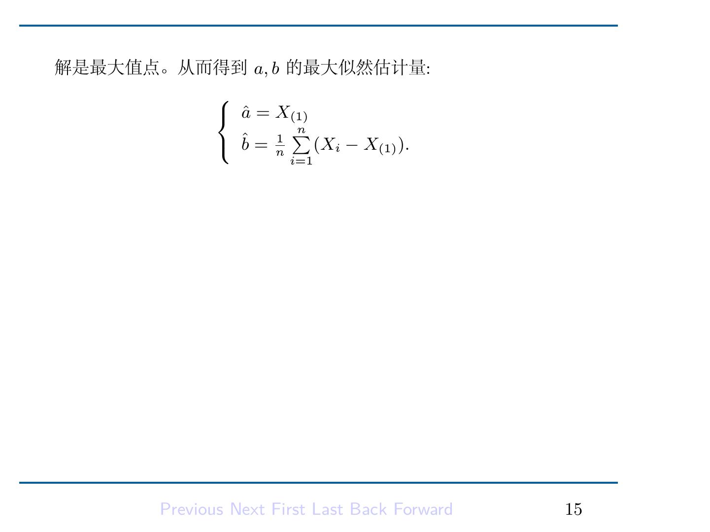 17 .解是最大值点。从而得到 a, b 的最大似然估计量: a ˆ = X(1) ∑ n b = n1 ˆ (Xi − X(1) ). i=1 Previous Next First Last Back Forward 15