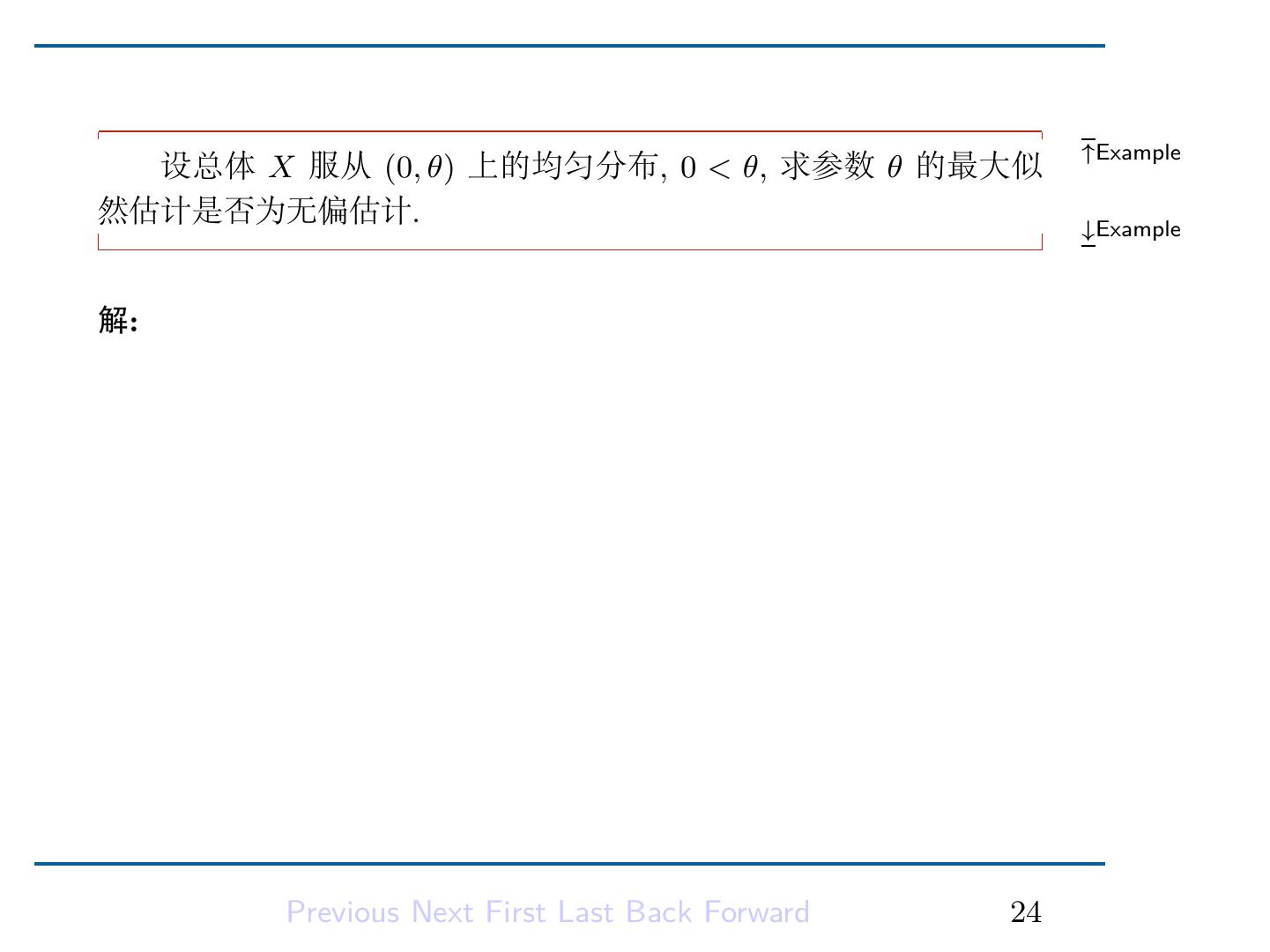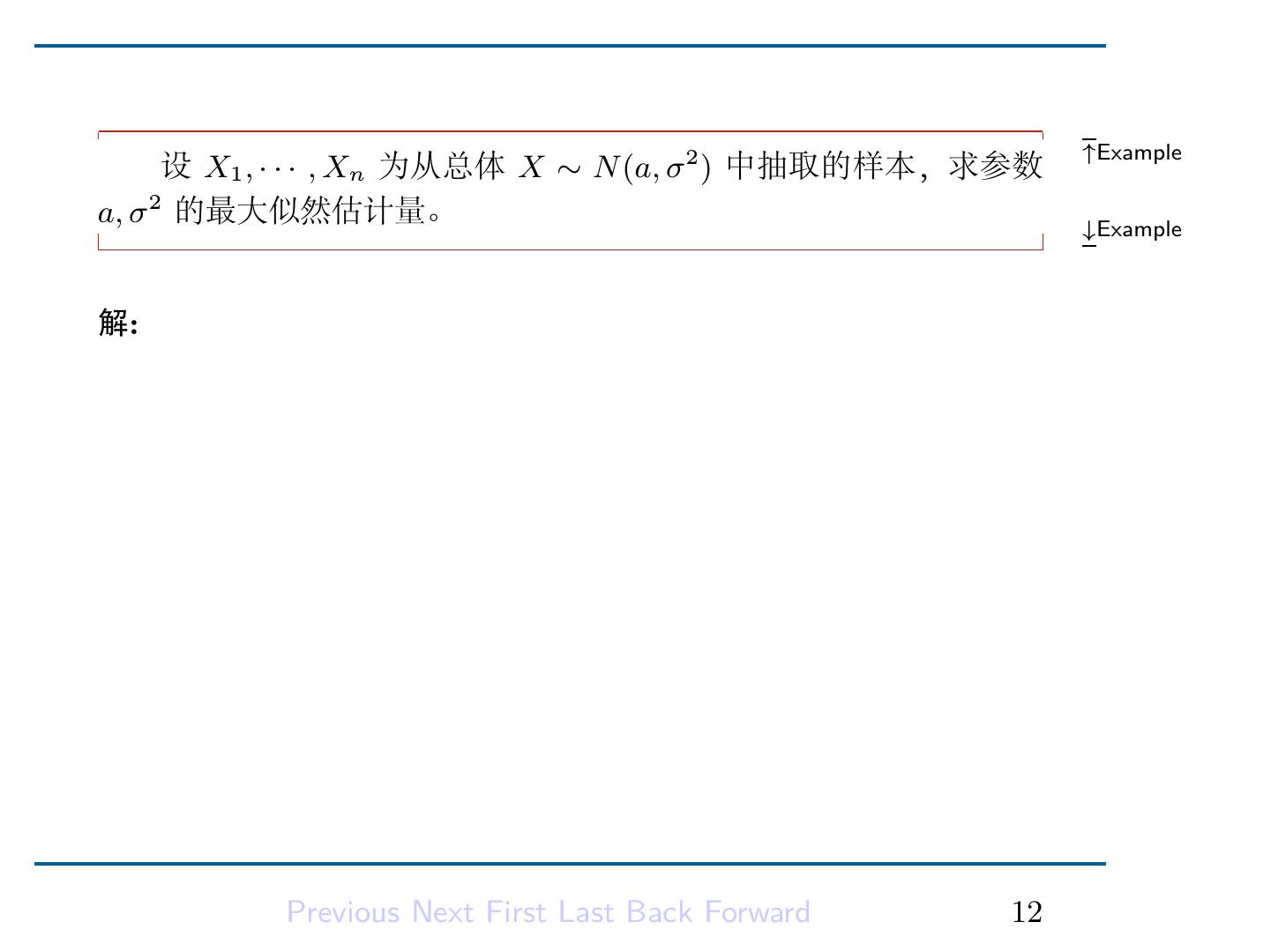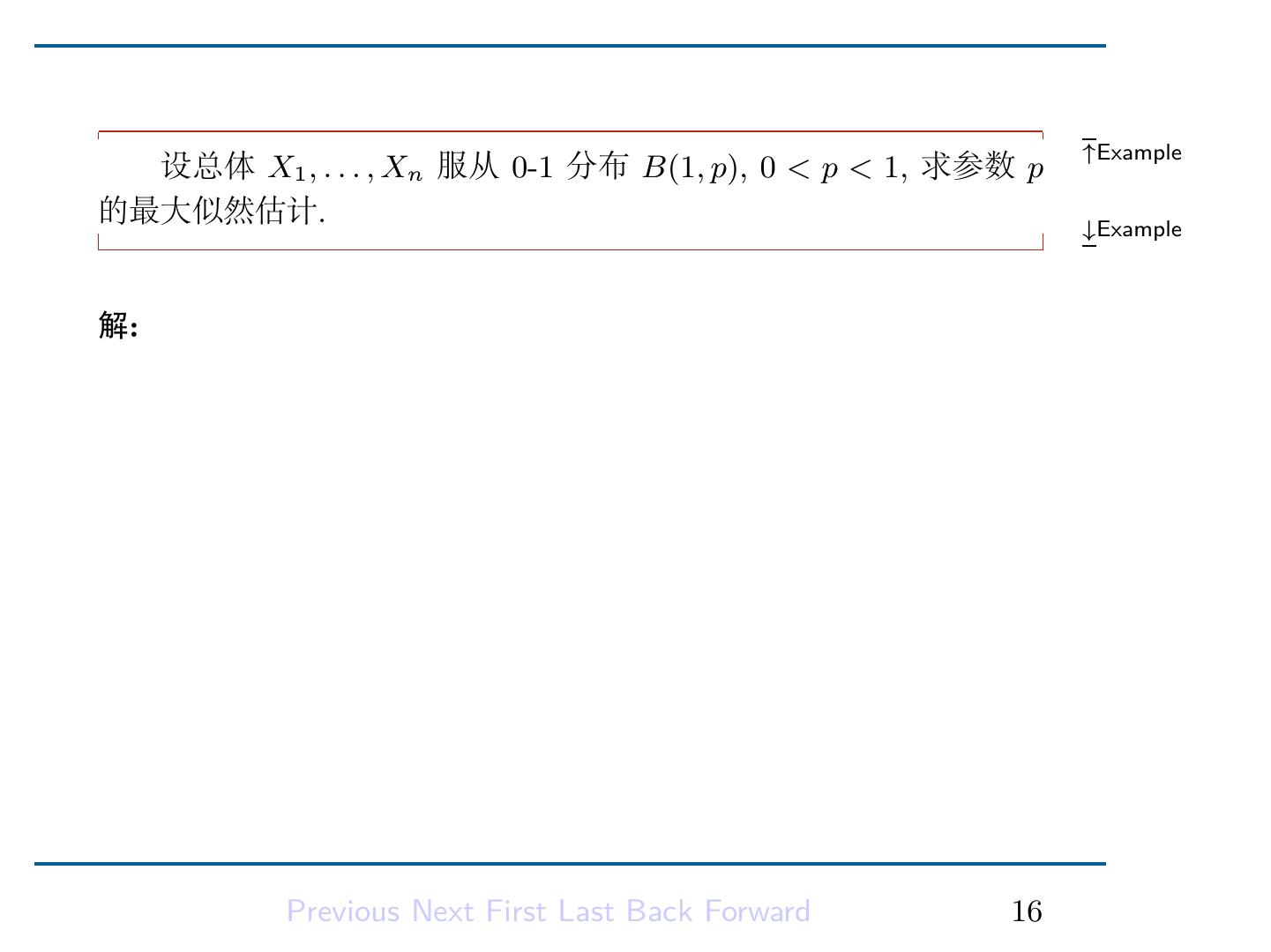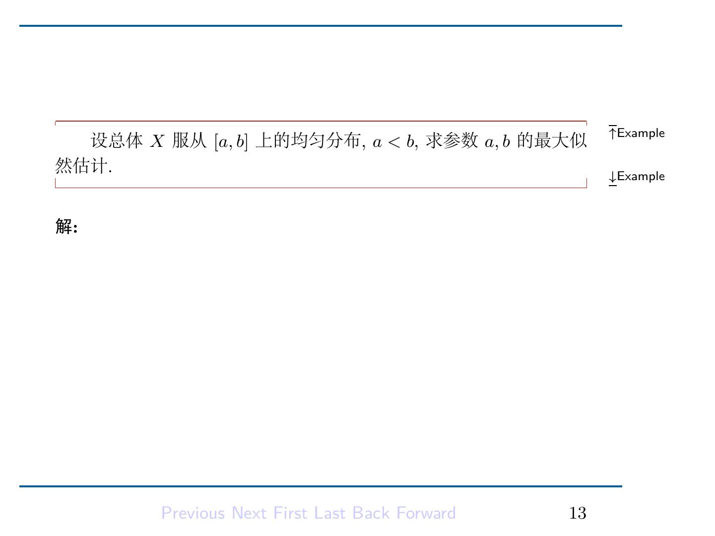 17 .解是最大值点。从而得到 a, b 的最大似然估计量: a ˆ = X(1) ∑ n b = n1 ˆ (Xi − X(1) ). i=1 Previous Next First Last Back Forward 15