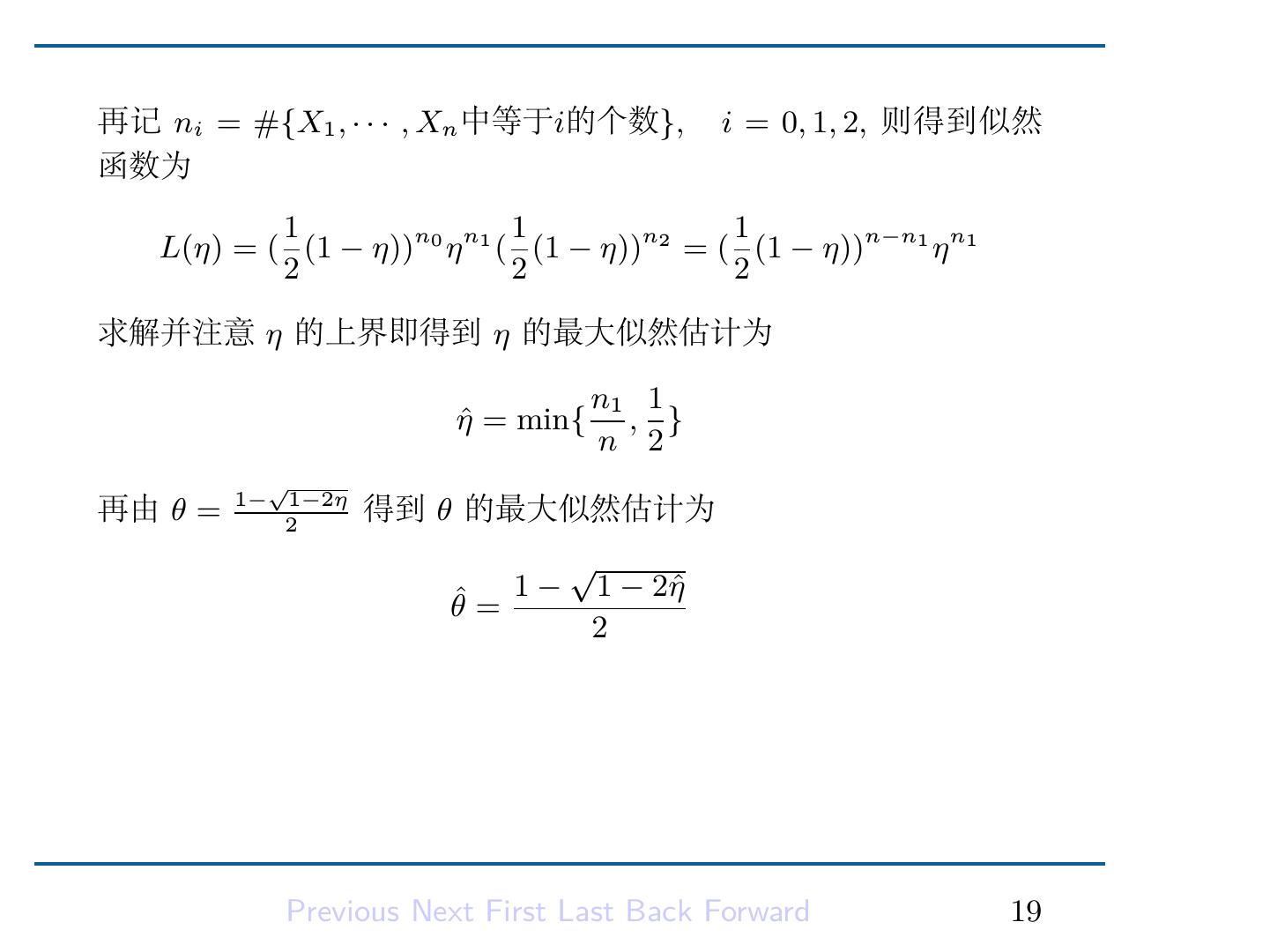 21 .再记 ni = #{X1 , · · · , Xn 中等于i的个数}, i = 0, 1, 2, 则得到似然 函数为 1 1 1 L(η) = ( (1 − η))n0 η n1 ( (1 − η))n2 = ( (1 − η))n−n1 η n1 2 2 2 求解并注意 η 的上界即得到 η 的最大似然估计为 n1 1 ηˆ = min{ , } n 2 √ 1− 1−2η 再由 θ = 2 得到 θ 的最大似然估计为 √ 1− 1 − 2ˆ η θˆ = 2 Previous Next First Last Back Forward 19