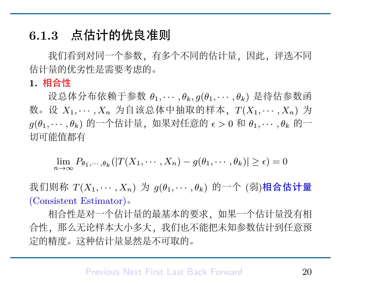 22 .6.1.3 点估计的优良准则 我们看到对同一个参数,有多个不同的估计量,因此,评选不同 估计量的优劣性是需要考虑的。 1. 相合性 设总体分布依赖于参数 θ1 , · · · , θk , g(θ1 , · · · , θk ) 是待估参数函 数。设 X1 , · · · , Xn 为自该总体中抽取的样本,T (X1 , · · · , Xn ) 为 g(θ1 , · · · , θk ) 的一个估计量,如果对任意的 ϵ > 0 和 θ1 , · · · , θk 的一 切可能值都有 lim Pθ1 ,··· ,θk (|T (X1 , · · · , Xn ) − g(θ1 , · · · , θk )| ≥ ϵ) = 0 n→∞ 我们则称 T (X1 , · · · , Xn ) 为 g(θ1 , · · · , θk ) 的一个 (弱)相合估计量 (Consistent Estimator)。 相合性是对一个估计量的最基本的要求,如果一个估计量没有相 合性,那么无论样本大小多大,我们也不能把未知参数估计到任意预 定的精度。这种估计量显然是不可取的。 Previous Next First Last Back Forward 20