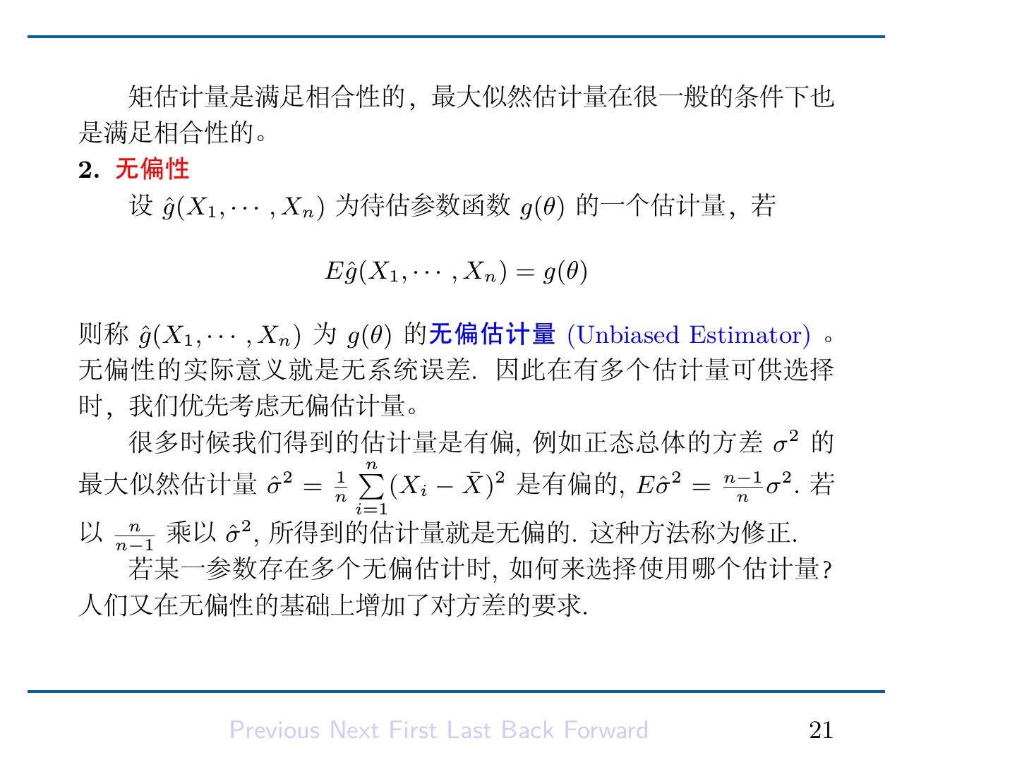 23 . 矩估计量是满足相合性的,最大似然估计量在很一般的条件下也 是满足相合性的。 2. 无偏性 设 gˆ(X1 , · · · , Xn ) 为待估参数函数 g(θ) 的一个估计量,若 g (X1 , · · · , Xn ) = g(θ) Eˆ 则称 gˆ(X1 , · · · , Xn ) 为 g(θ) 的无偏估计量 (Unbiased Estimator) 。 无偏性的实际意义就是无系统误差. 因此在有多个估计量可供选择 时,我们优先考虑无偏估计量。 很多时候我们得到的估计量是有偏, 例如正态总体的方差 σ 2 的 ∑n 最大似然估计量 σ ˆ2 = 1 n (Xi − X) ¯ 2 是有偏的, E σ ˆ 2 = n−1 σ 2 . 若 n i=1 2 以 乘以 σ n n−1 ˆ , 所得到的估计量就是无偏的. 这种方法称为修正. 若某一参数存在多个无偏估计时, 如何来选择使用哪个估计量? 人们又在无偏性的基础上增加了对方差的要求. Previous Next First Last Back Forward 21
